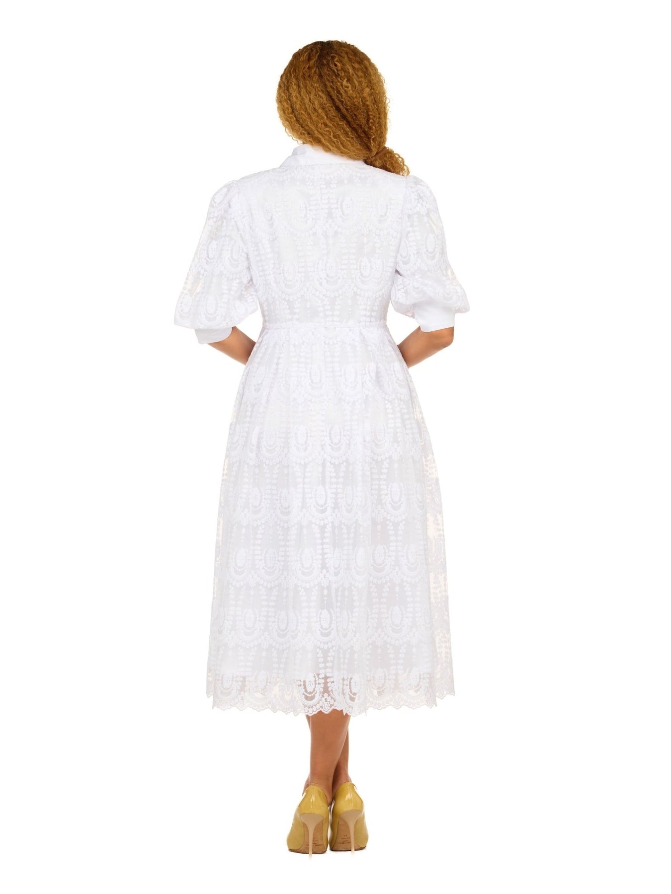 - This exquisite lace dress is crafted to make every woman feel radiant, confident, and effortlessly elegant. The classic shirt-dress neckline brings polish and poise, while the intricate lace overlay adds soft movement and romantic texture with every step. Puff sleeves offer a modern, feminine touch, and the flowing A-line midi dress creates a silhouette that flatters beautifully from every angle.