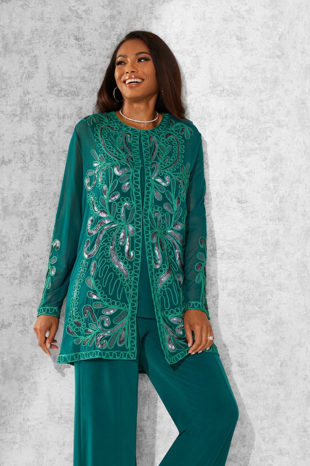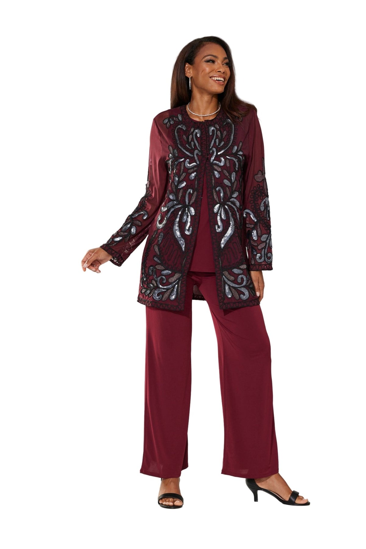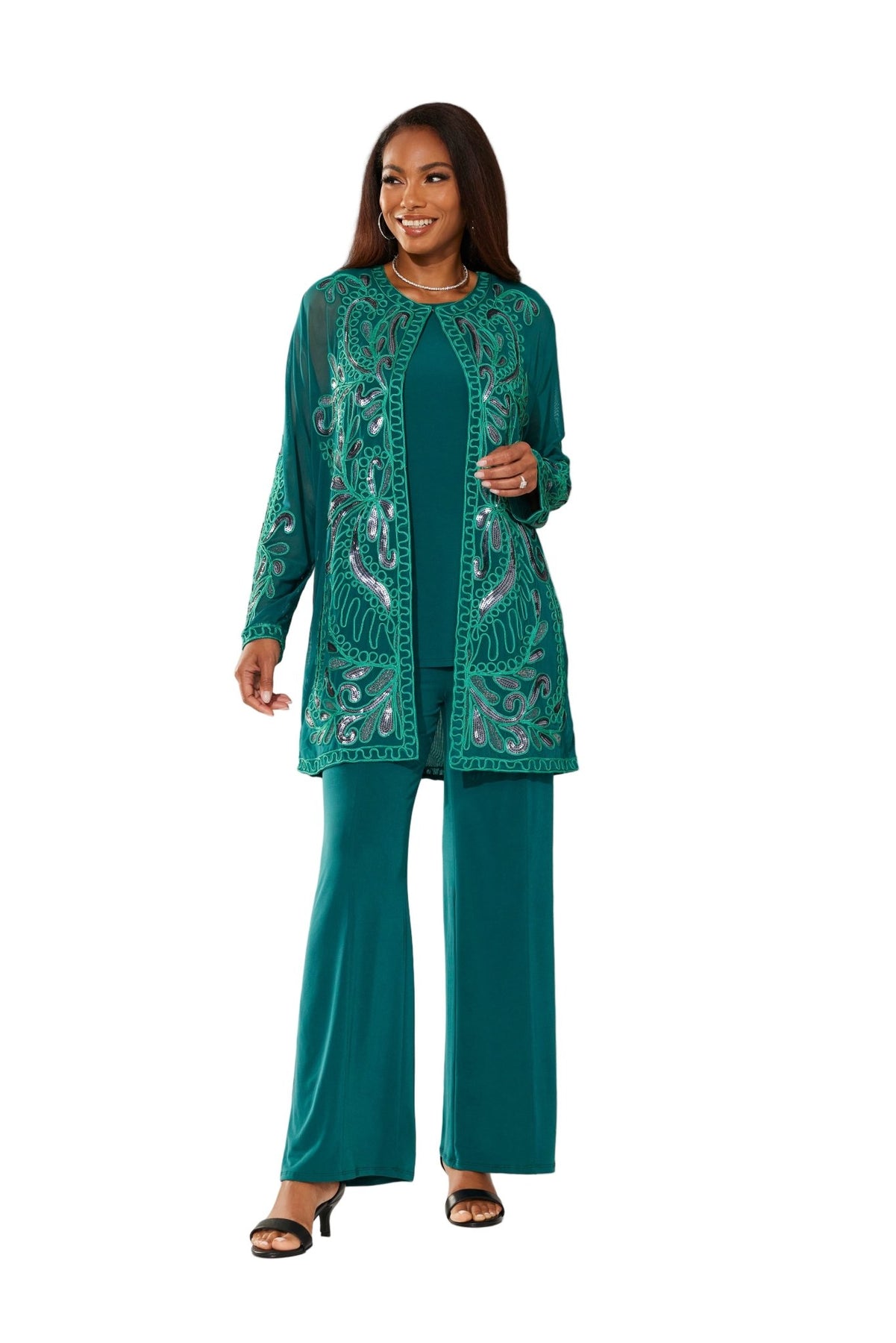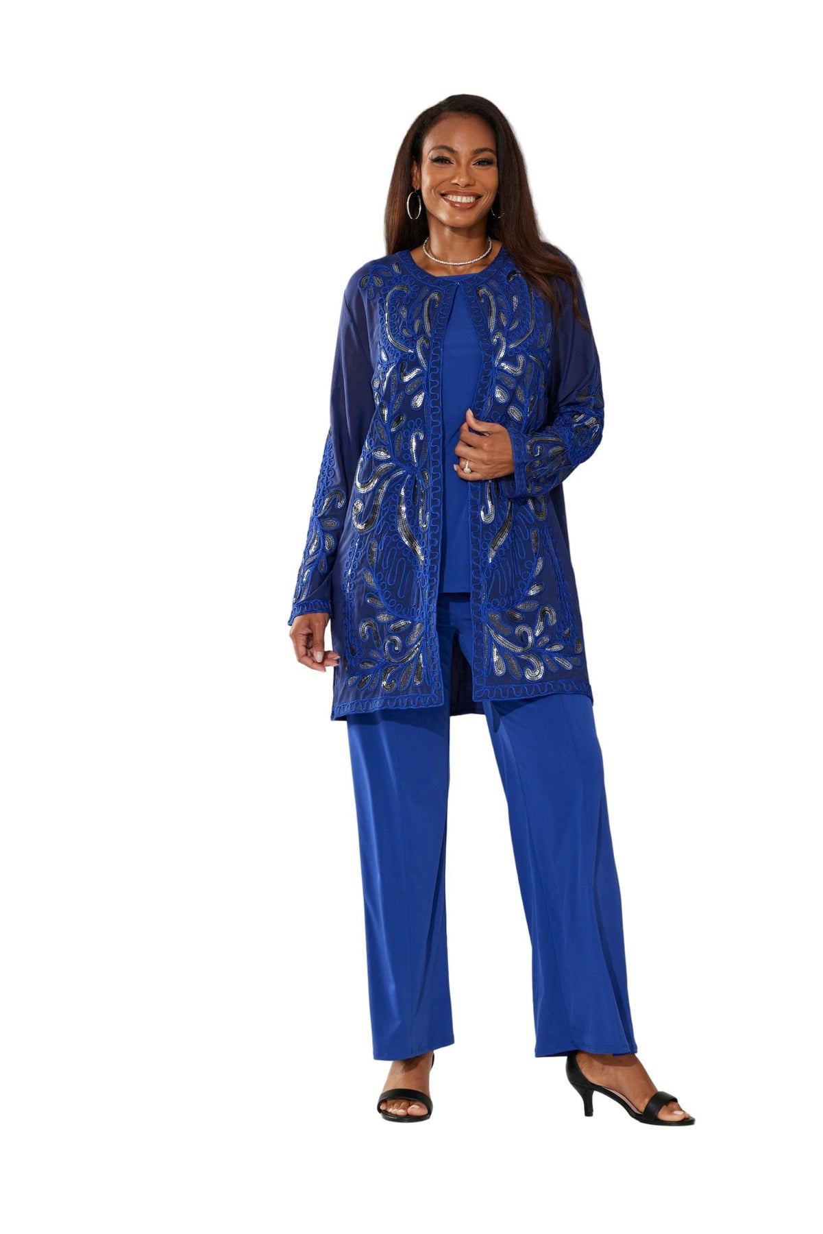 Lasting Impressions Pantset by Studio EY — Unforgettable fashion look embellished to perfection. Jacket: shimmery sequin appliques adorn the front/back and sleeves. Hook-and-eye closures. Full tank. Pant: relaxed-fit wide-leg styling. Especially Yours designer pantsets for ladies are always on-trend. They'll have you looking effortlessly polished and put-together wherever your day takes you. Fashion-forward style checks all the boxes when it comes to high class, sass and sophistication. A must-have in your outfit rotation. So comfortable, you'll reach for it often. Check out our entire collection of Especially Yours pantsets. At EY, we are committed to offering African American women the best in high-quality fashions at affordable prices. Especially Yours clothing offers Black women so many ways to express their beauty, heritage and faith. Love it? Simply click “Add to Cart”.