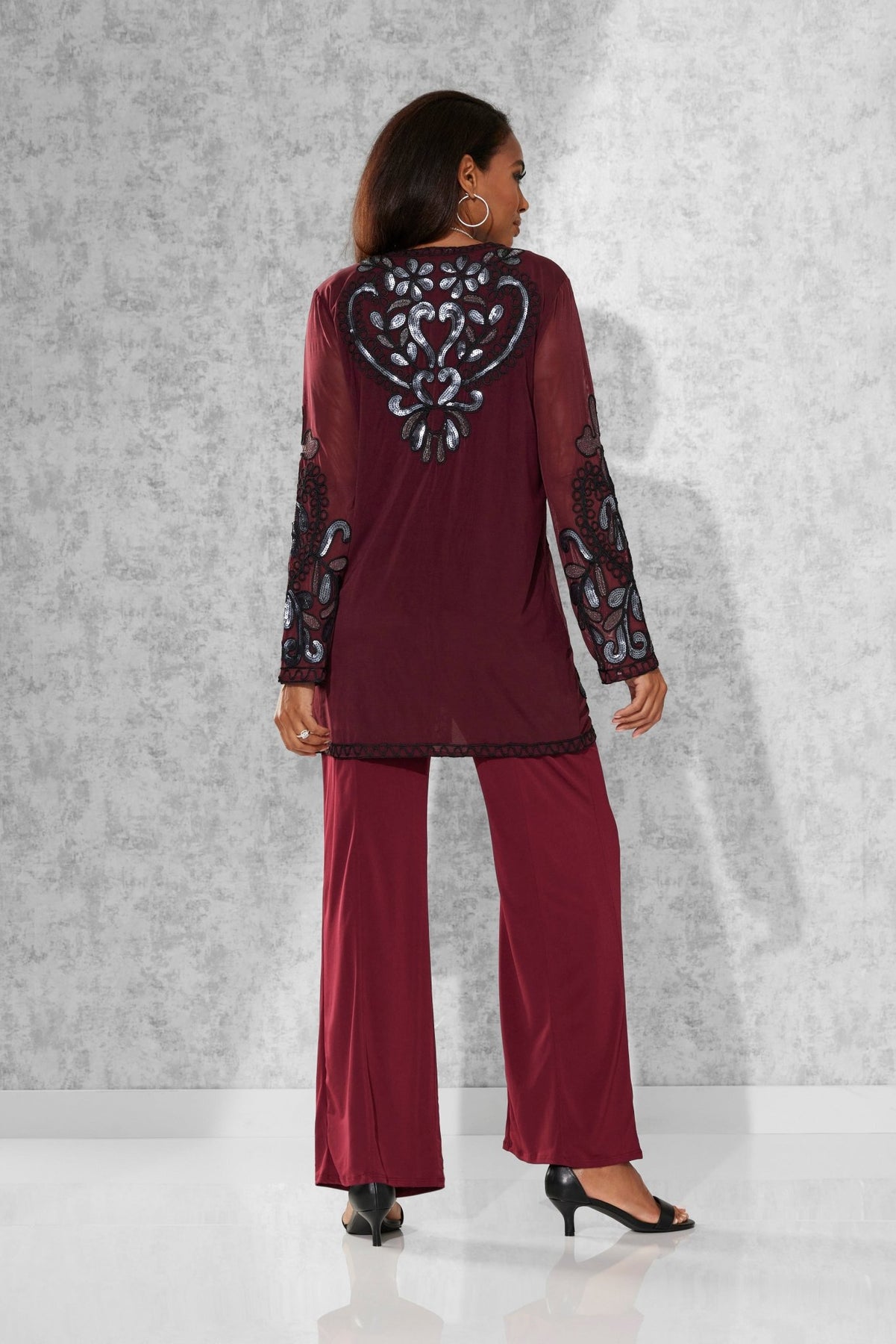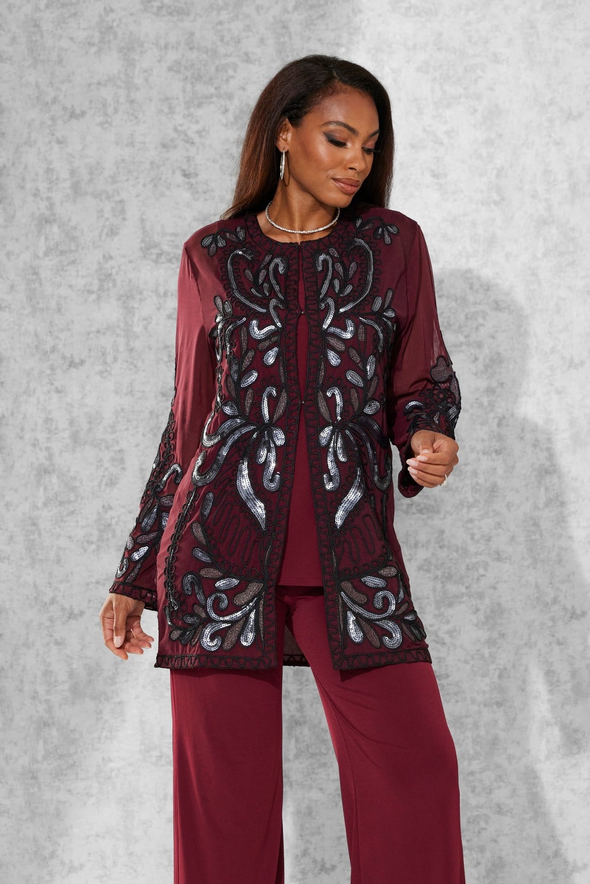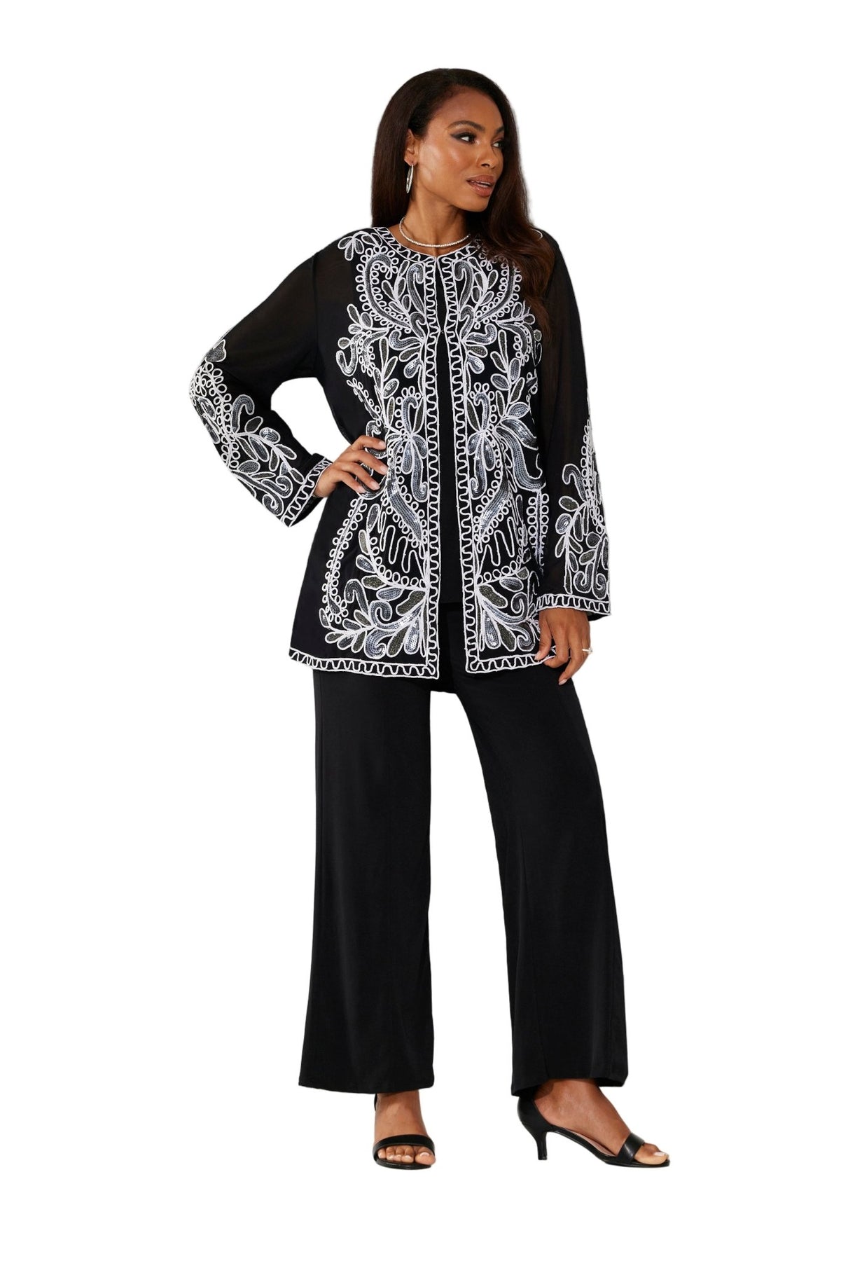Lasting Impressions Pantset by Studio EY — Unforgettable fashion look embellished to perfection. Jacket: shimmery sequin appliques adorn the front/back and sleeves. Hook-and-eye closures. Full tank. Pant: relaxed-fit wide-leg styling. Especially Yours designer pantsets for ladies are always on-trend. They'll have you looking effortlessly polished and put-together wherever your day takes you. Fashion-forward style checks all the boxes when it comes to high class, sass and sophistication. A must-have in your outfit rotation. So comfortable, you'll reach for it often. Check out our entire collection of Especially Yours pantsets. At EY, we are committed to offering African American women the best in high-quality fashions at affordable prices. Especially Yours clothing offers Black women so many ways to express their beauty, heritage and faith. Love it? Simply click “Add to Cart”.