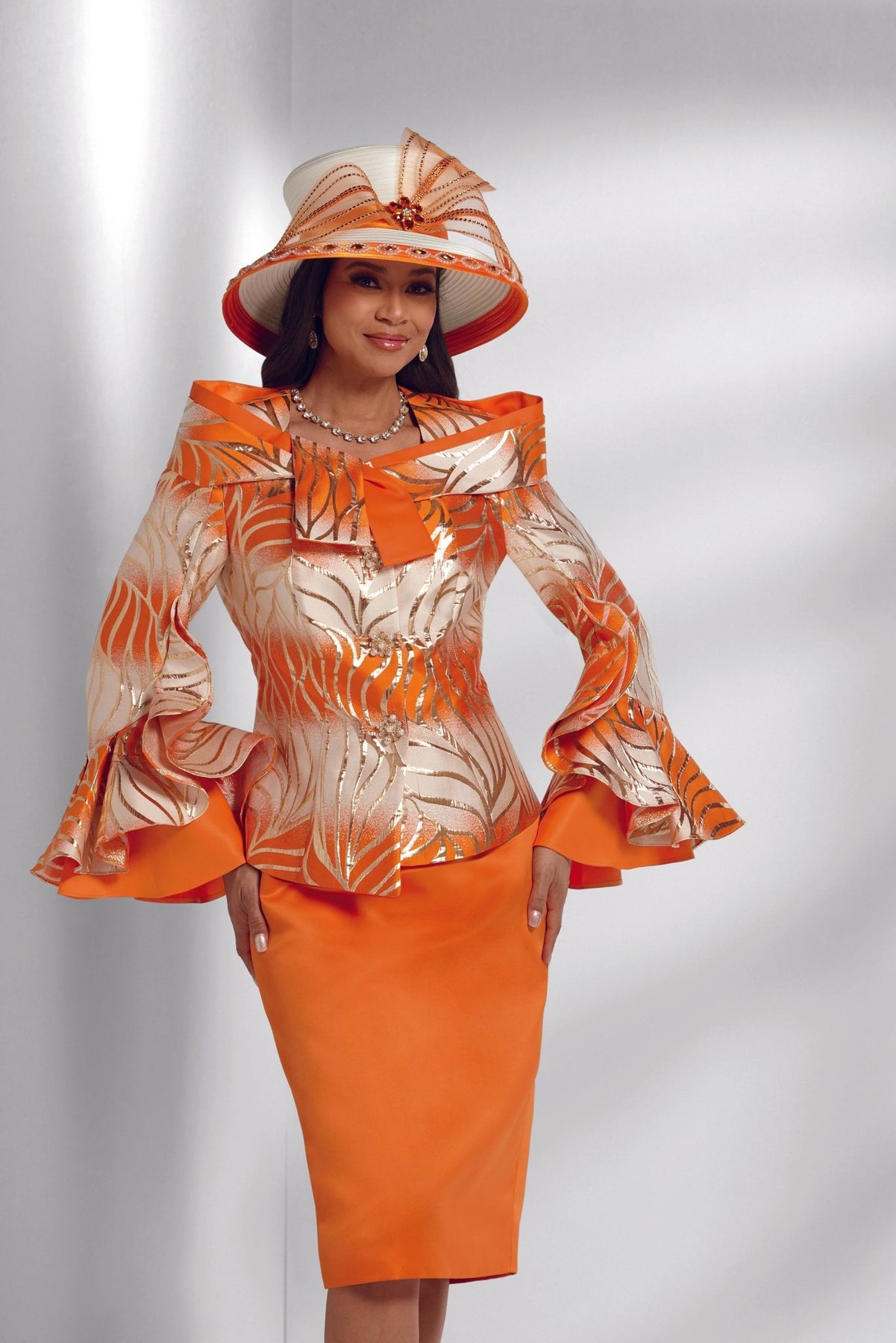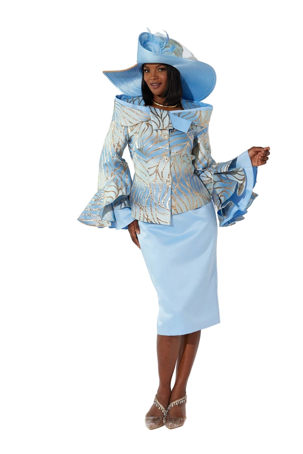 Metallic brocade creates a stunning foliage design that makes this ensemble the definition of high-quality fashion. As a standout in our designer church suits collection, this look ensures you stay effortlessly polished and put-together. The 27" jacket features a portrait collar, jeweled buttons, and dramatic flounce sleeves, while the 30" skirt offers a side-elastic waist for a perfect fit. Whether you are searching for elegant church suits for ladies or a special occasion masterpiece, this light blue beauty delivers. It is a premier choice for ladies church suits, designed to keep you confident and polished for Sunday service or a formal church banquet. Express your faith in a classy, elegant style that celebrates your heritage and makes you feel like royalty.