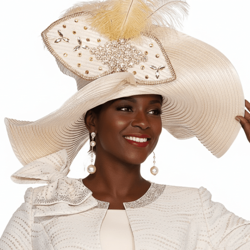 Step out in divine style with this fabulous Champagne church hat, designed to make a statement. Its wide brim offers sophisticated elegance, while delicate embellishments add a touch of sparkle. Perfect for adding a glamorous touch to your special occasion ensemble. This hat ensures you look and feel absolutely radiant, capturing attention with every turn.