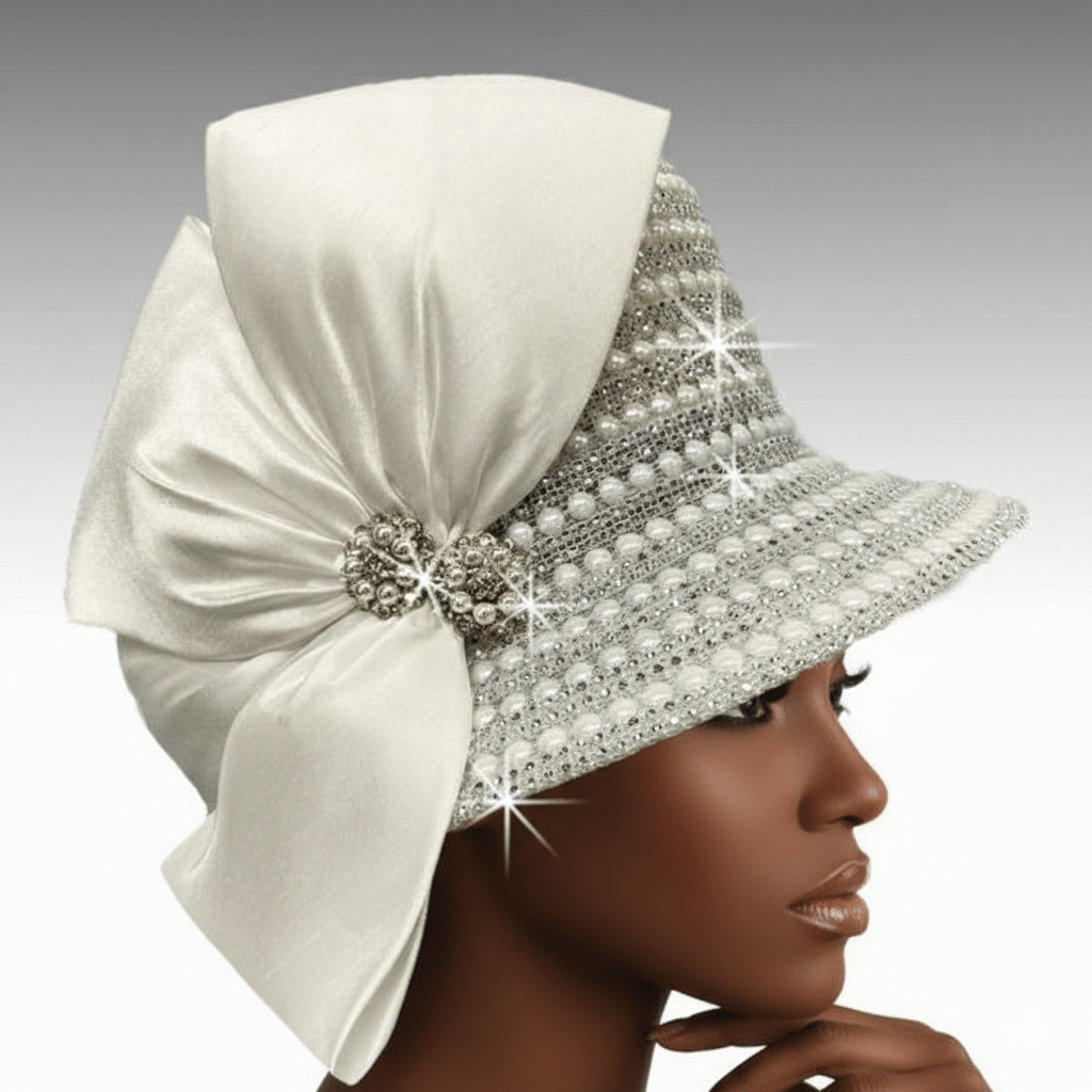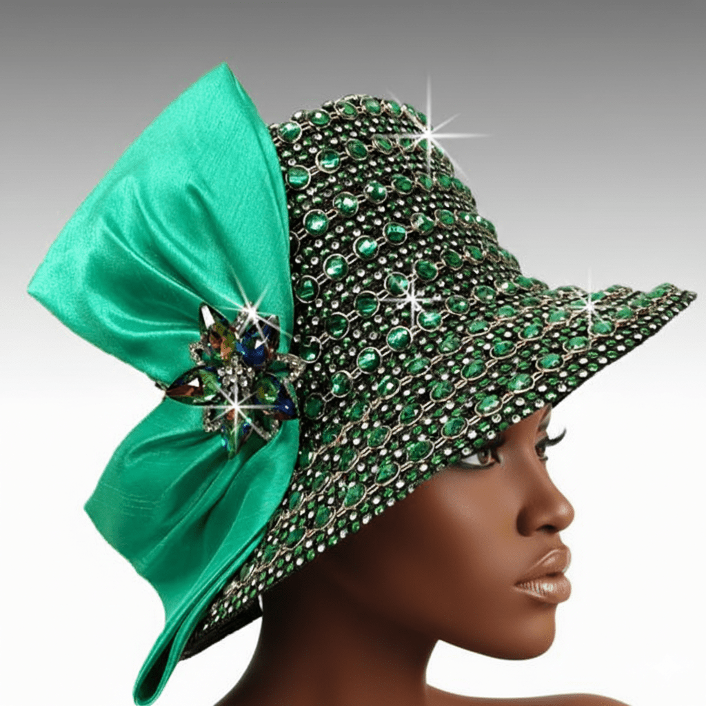 Sumptuous jewel encrusted bucket. Our most popular jewel laden bucket(2150) has been reinvented this season to include multiple rows of magnificent faceted tonal jewels. An exquisite crystal brooch finishes this extravagant look. Available in a vast array of  colors. Adjustable sweatband allows for different head sizes.