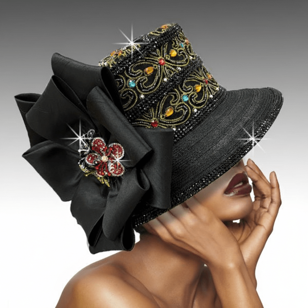 What is more festive than Fruitcake? This bucket hat with its 3.5″ brim and 4.5″ square crown encapsulates the rich spicy feeling of the season in a stylish manner. The jewel and sequin embroidery adorn the crown and sides. An expertly crafted 10 point bow sits at an angle above the eye and nestles a trio of jewel flowers. The adjustable sweatband allows for different head sizes