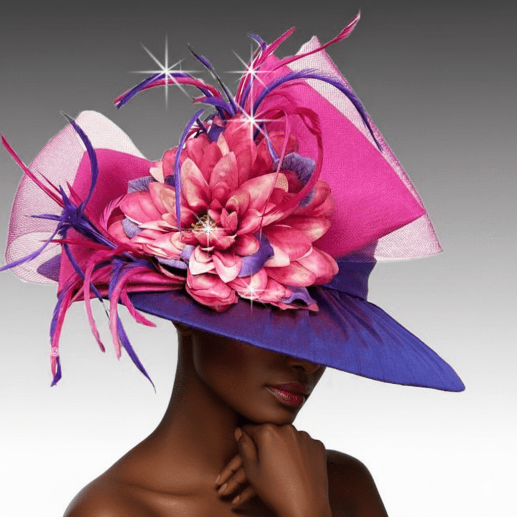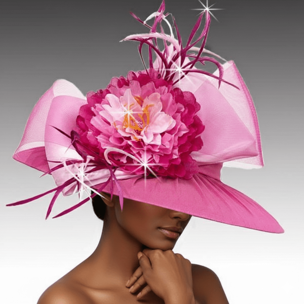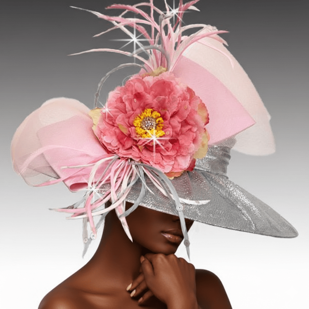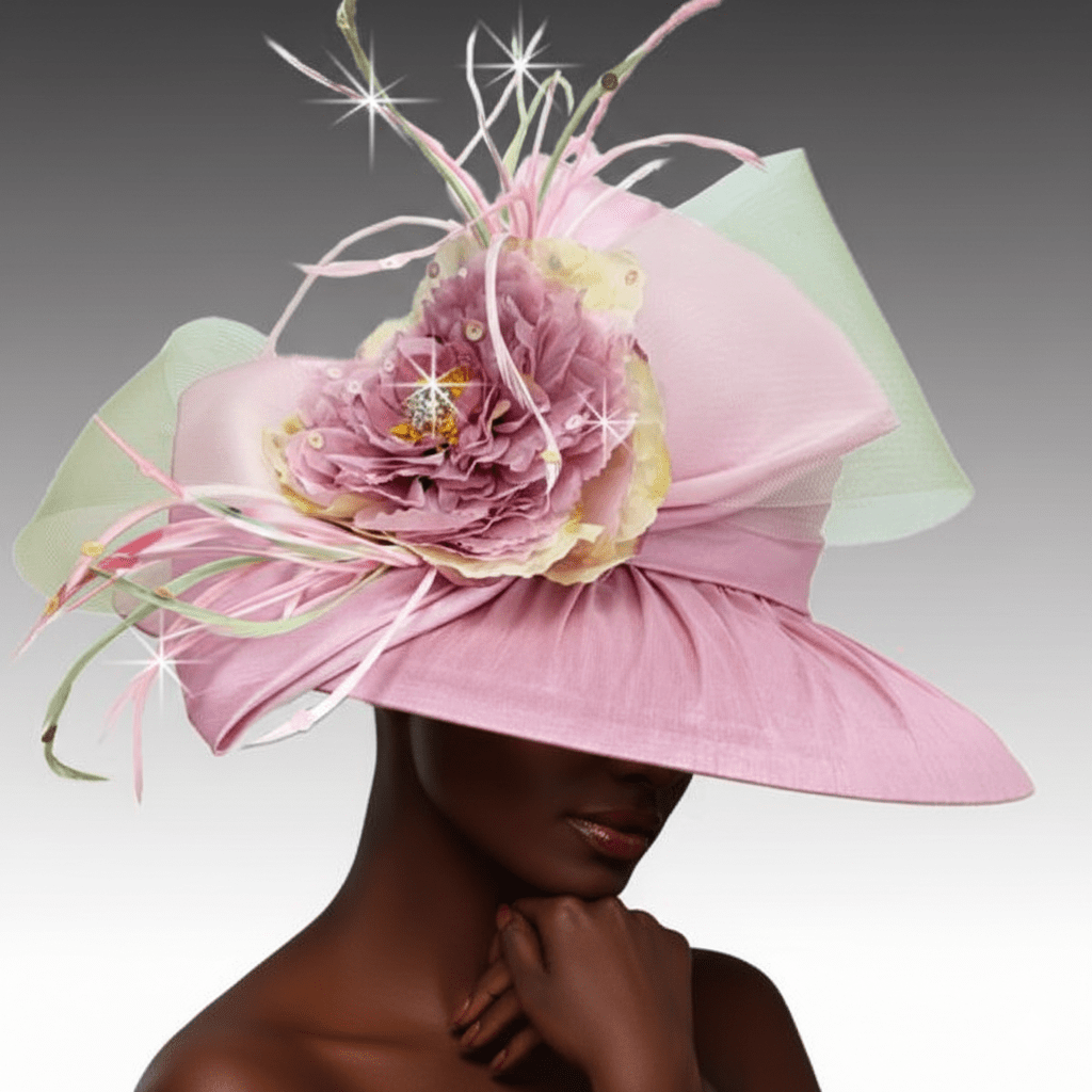 Balmoral exudes timeless sophistication and refined craftsmanship. With its graceful 4.5-inch brim, this hat offers just the right sweep for drama without excess. The entire body is meticulously draped in lustrous Shantung. Above the right eye rests a delicate translucent mesh bow. Nestled within it is a sumptuous bloom framed by soft, tonal feathers. Inside, an adjustable sweatband ensures comfort and a tailored fit for varying head sizes.