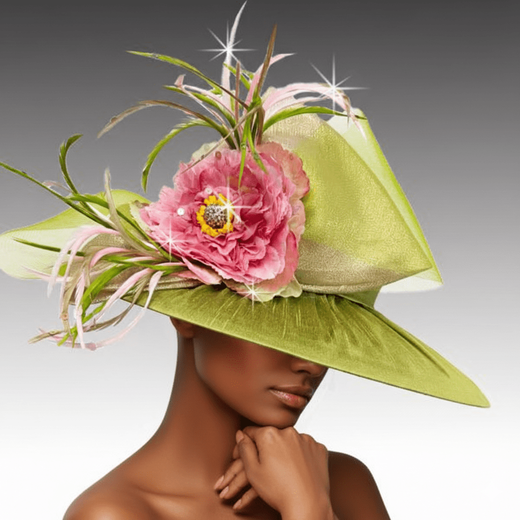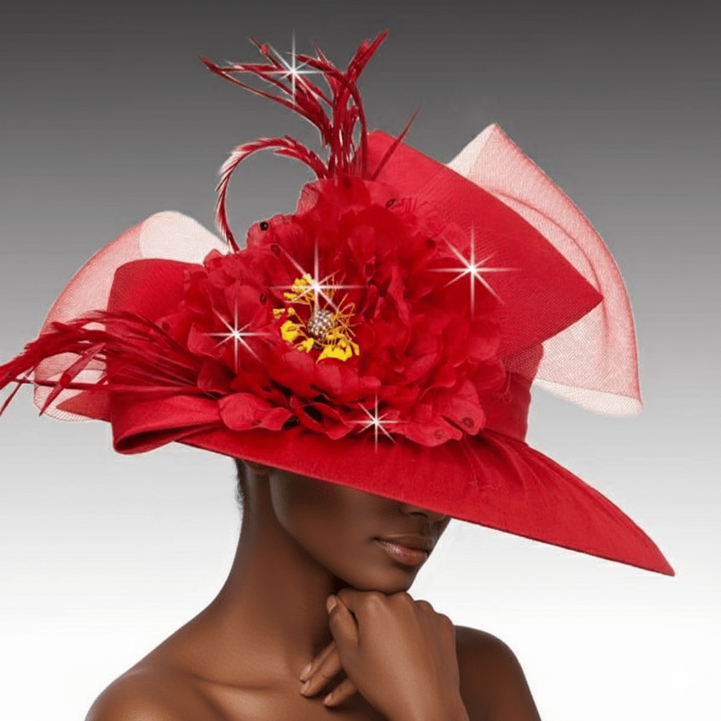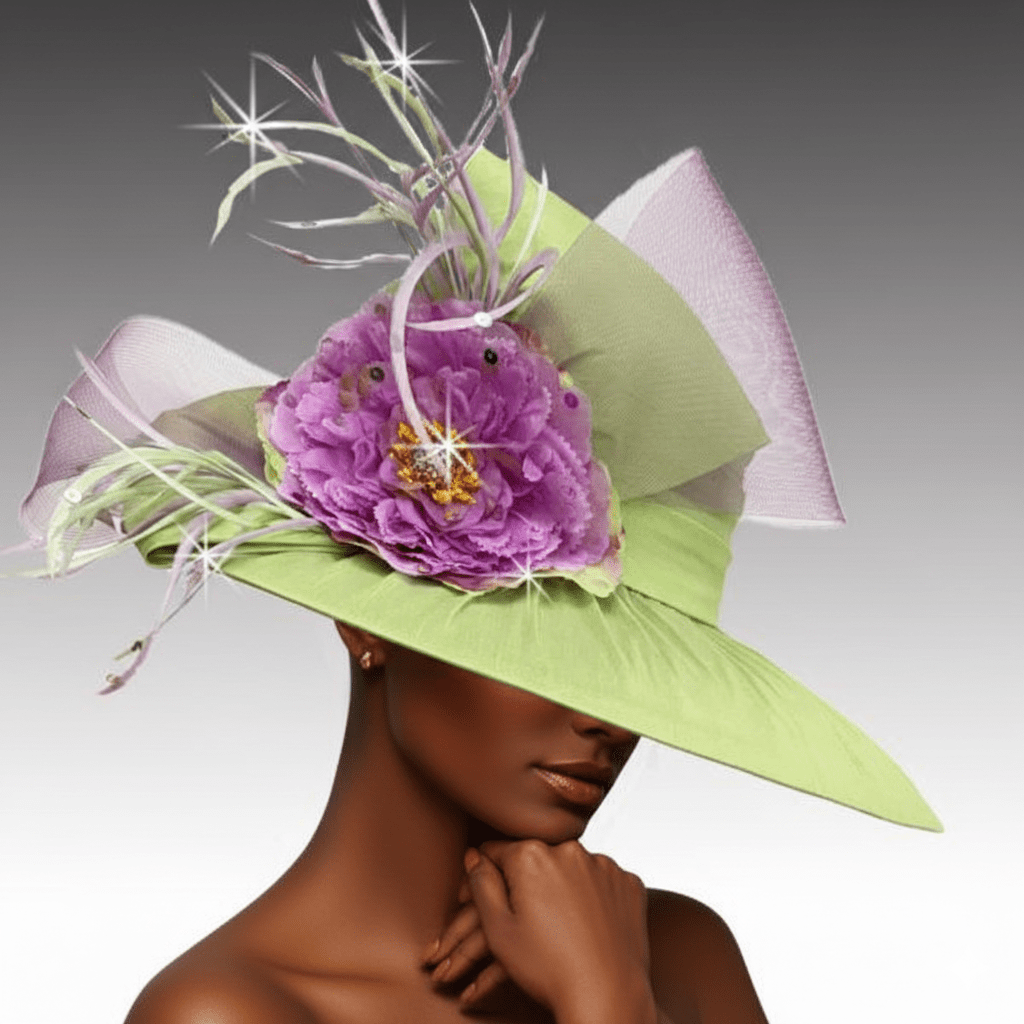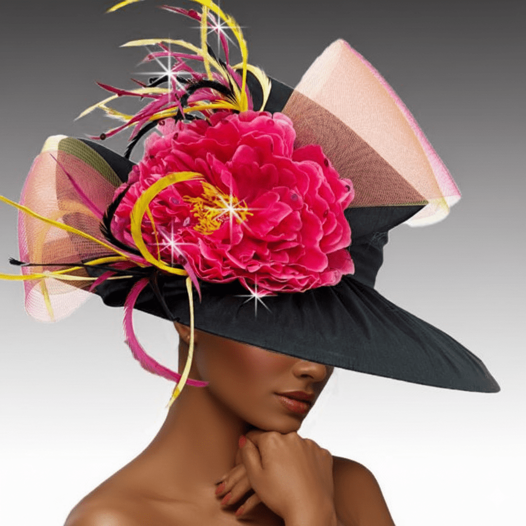 Balmoral exudes timeless sophistication and refined craftsmanship. With its graceful 4.5-inch brim, this hat offers just the right sweep for drama without excess. The entire body is meticulously draped in lustrous Shantung. Above the right eye rests a delicate translucent mesh bow. Nestled within it is a sumptuous bloom framed by soft, tonal feathers. Inside, an adjustable sweatband ensures comfort and a tailored fit for varying head sizes.