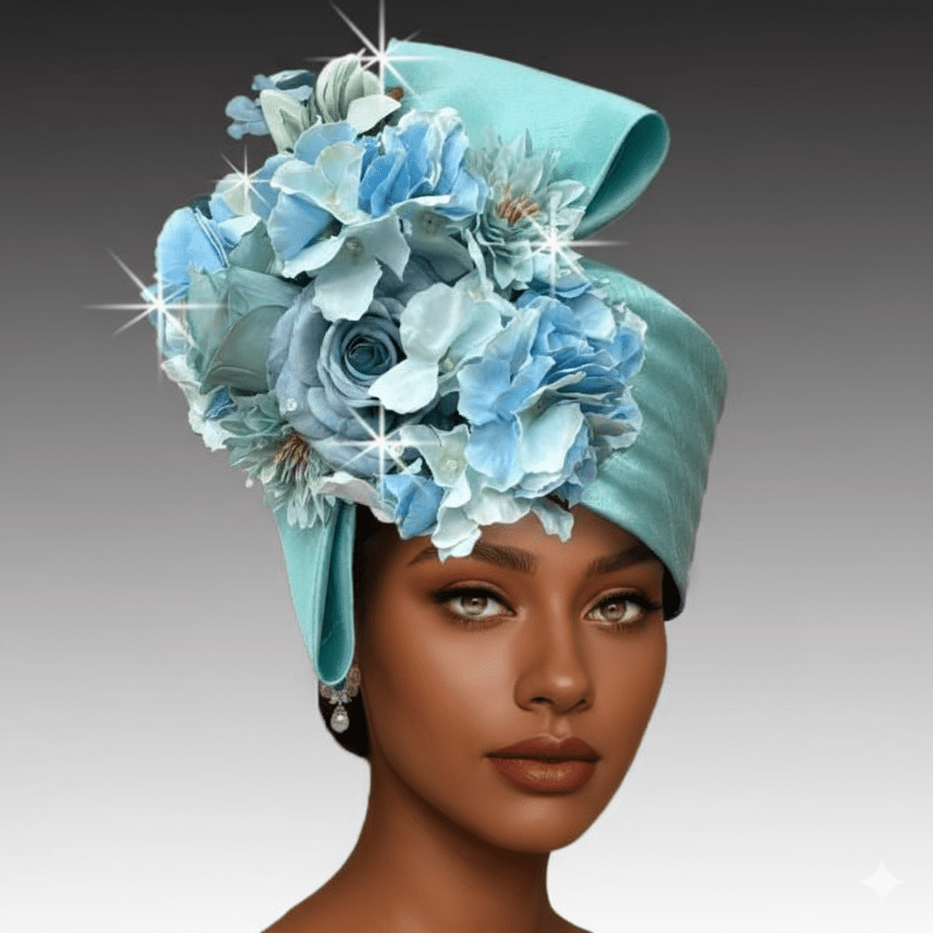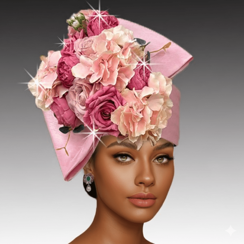 The NOSEGAY is a charming and timeless classic pillbox hat, measuring approximately 4.5 inches in height. The entire body is draped in fine fabric, giving it a soft, seamless finish that enhances its vintage sophistication. On one side, a matching bow is artfully placed. The bow serves as a backdrop for an exquisite arrangement of lush flowers. A dusting of sequins appear like glistening raindrops. An adjustable sweatband allows for varying head sizes.