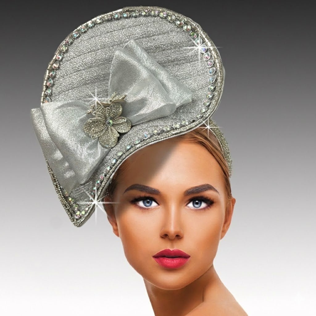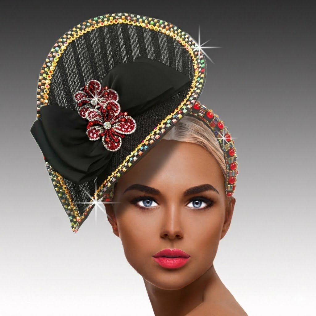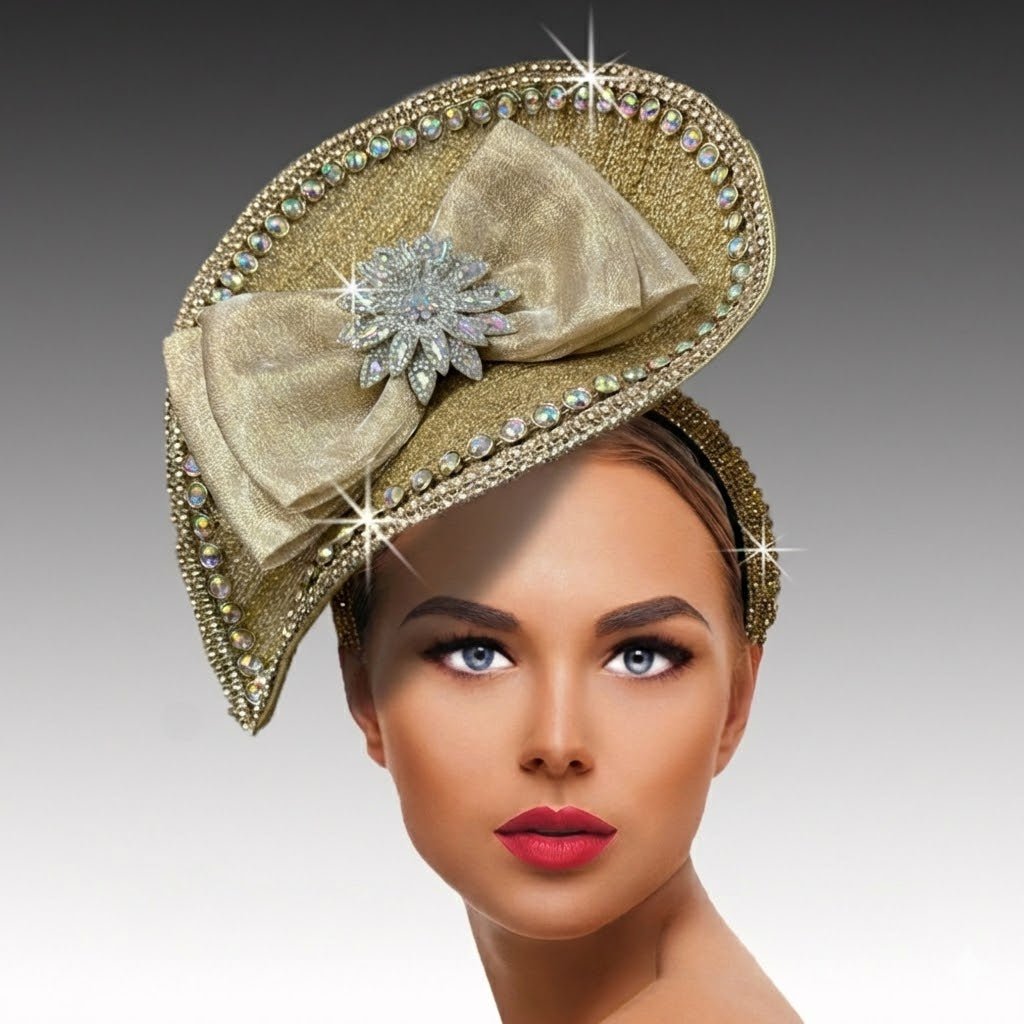 Marguerite is a headband fascinator that radiates regal glamor. Its sleek teardrop-shaped disk, measuring 12 inches in length and 9 inches at its widest point, creates a striking yet elegant silhouette. The headband itself is fully encrusted in dazzling jewels, offering a seamless sparkle that continues through the design. A frame of color-coordinated gems outlines the disk, drawing the eye toward its centerpiece: a glittering crystal flower that blooms with brilliance.