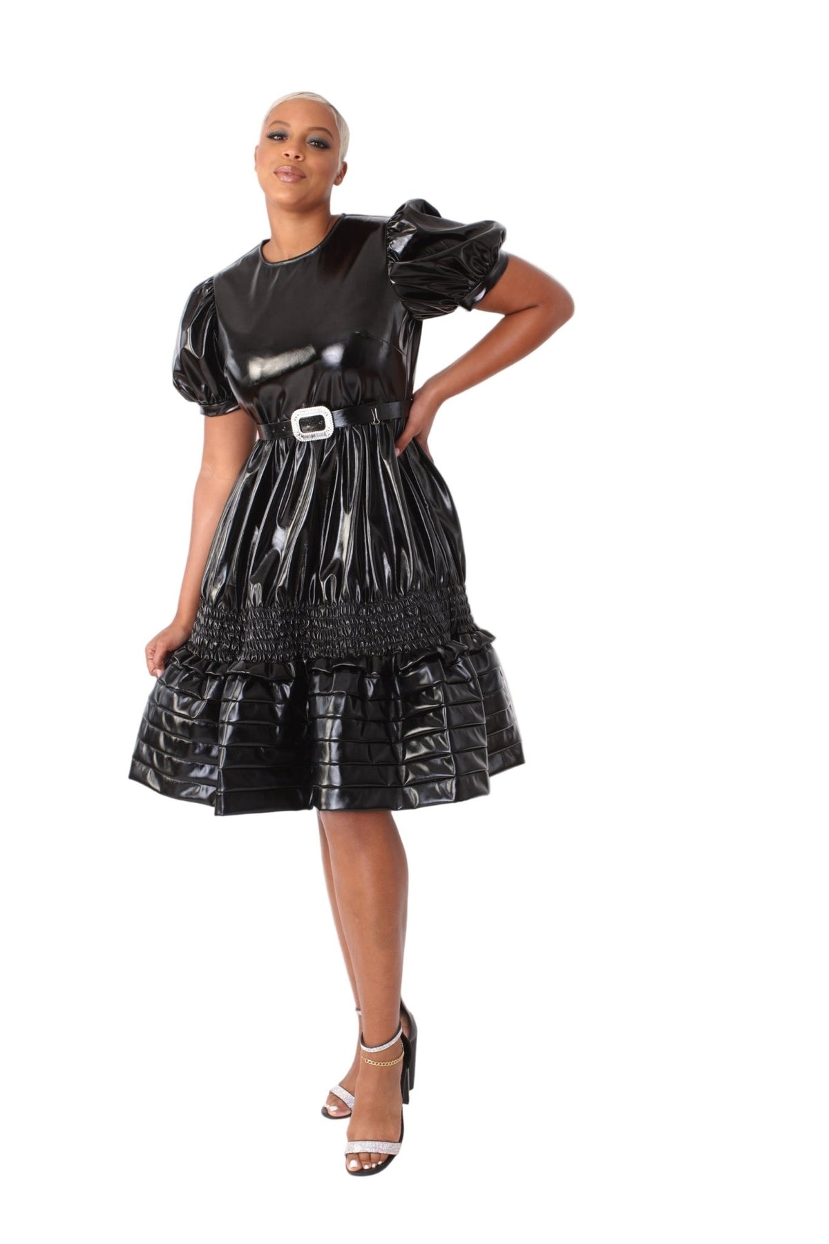 Add glamour to any occasion in this high gloss faux leather dress. Featuring puff sleeves, ruffle hem with rhinestone belt.