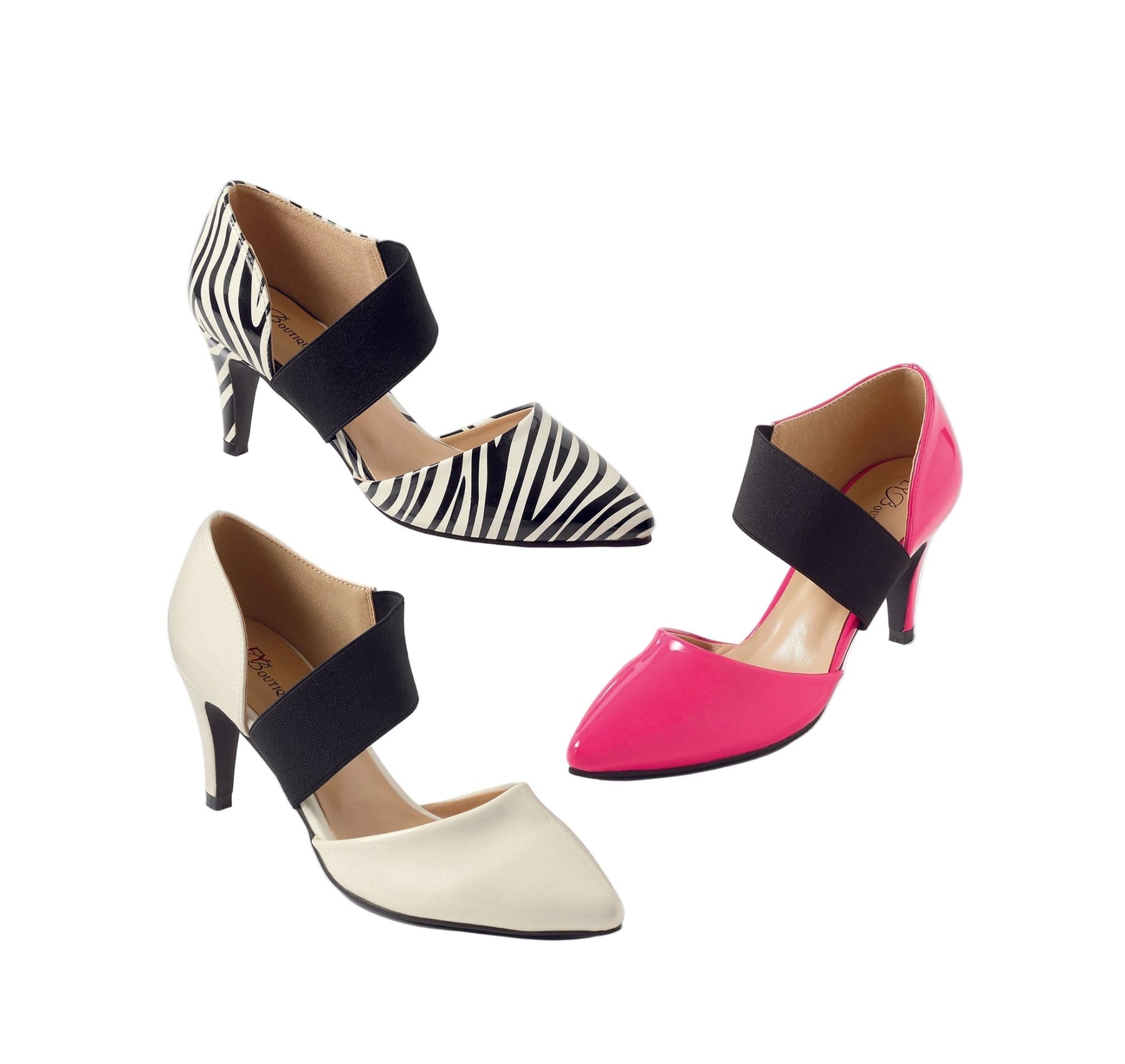 Put your best foot forward in these stylish and smooth leatherette pumps with swerving, curving elasticized straps. 2 3/4" heels. Cushioned insoles. Fabric and manmade materials. Imported.