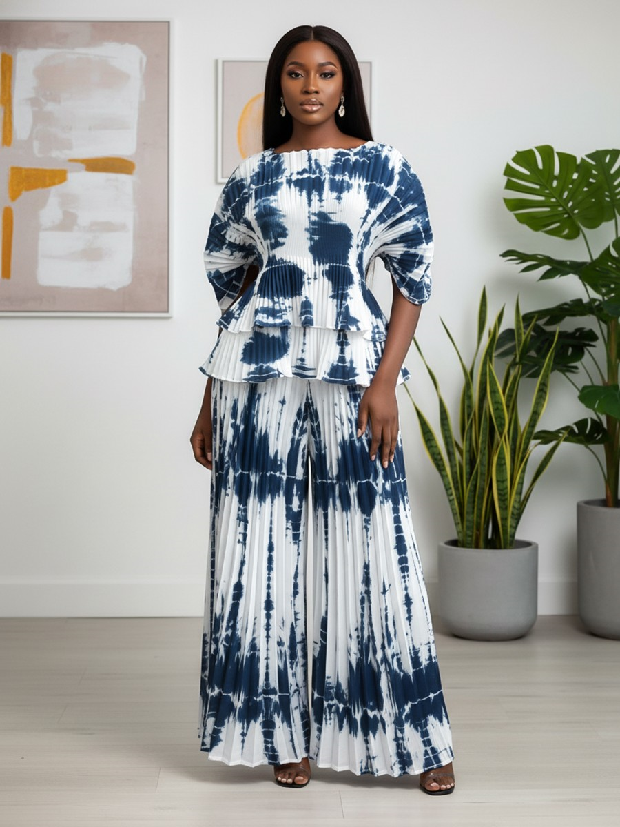 Stand out in this pleated tie-dye peplum pantset featuring a sculpted peplum top and flowy wide-leg pants. Designed with lightweight pleated fabric and bold patterning, this two-piece set delivers effortless movement and statement style.