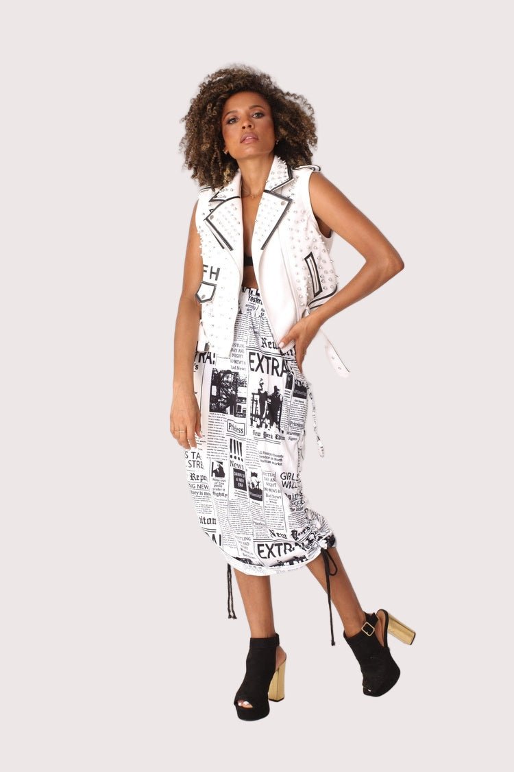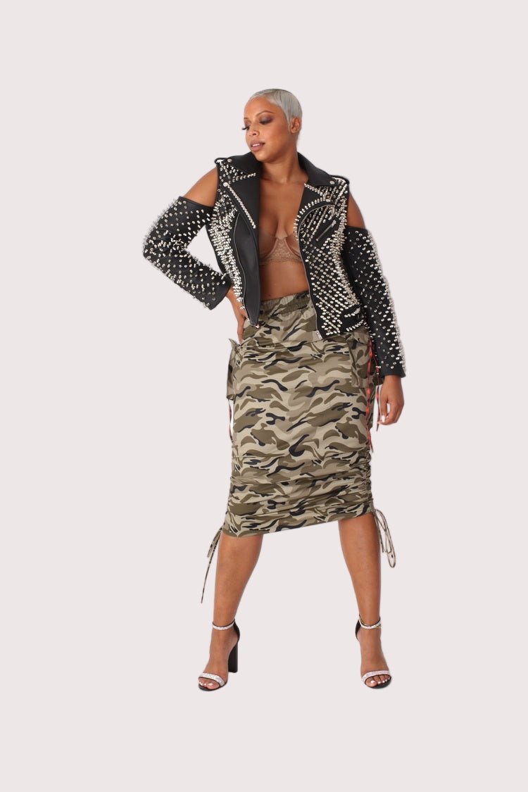 This stylish midi skirt features a bold print, available in either camo or newsprint patterns. The ruched waistline and adjustable drawstring details create a flattering, figure-skimming silhouette.