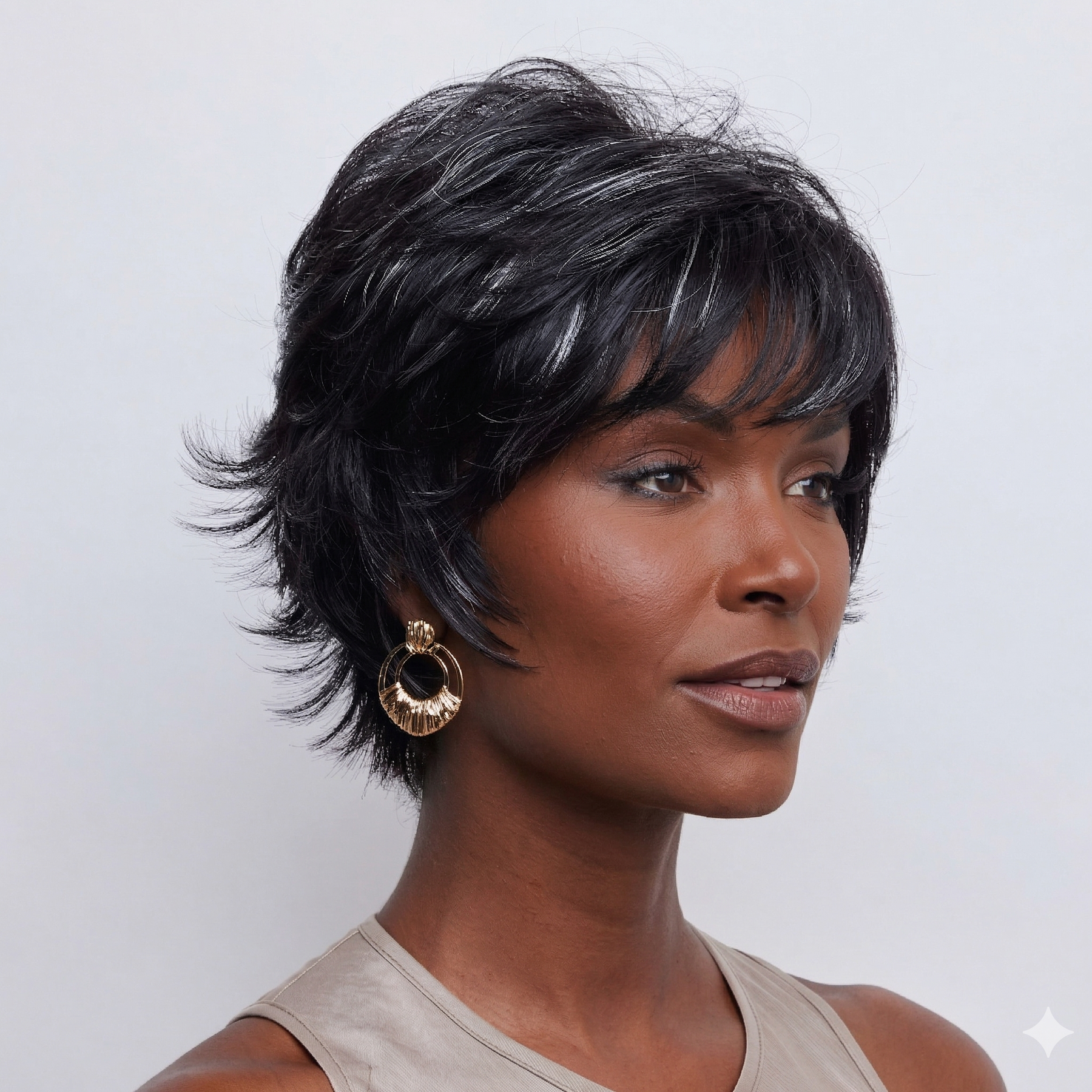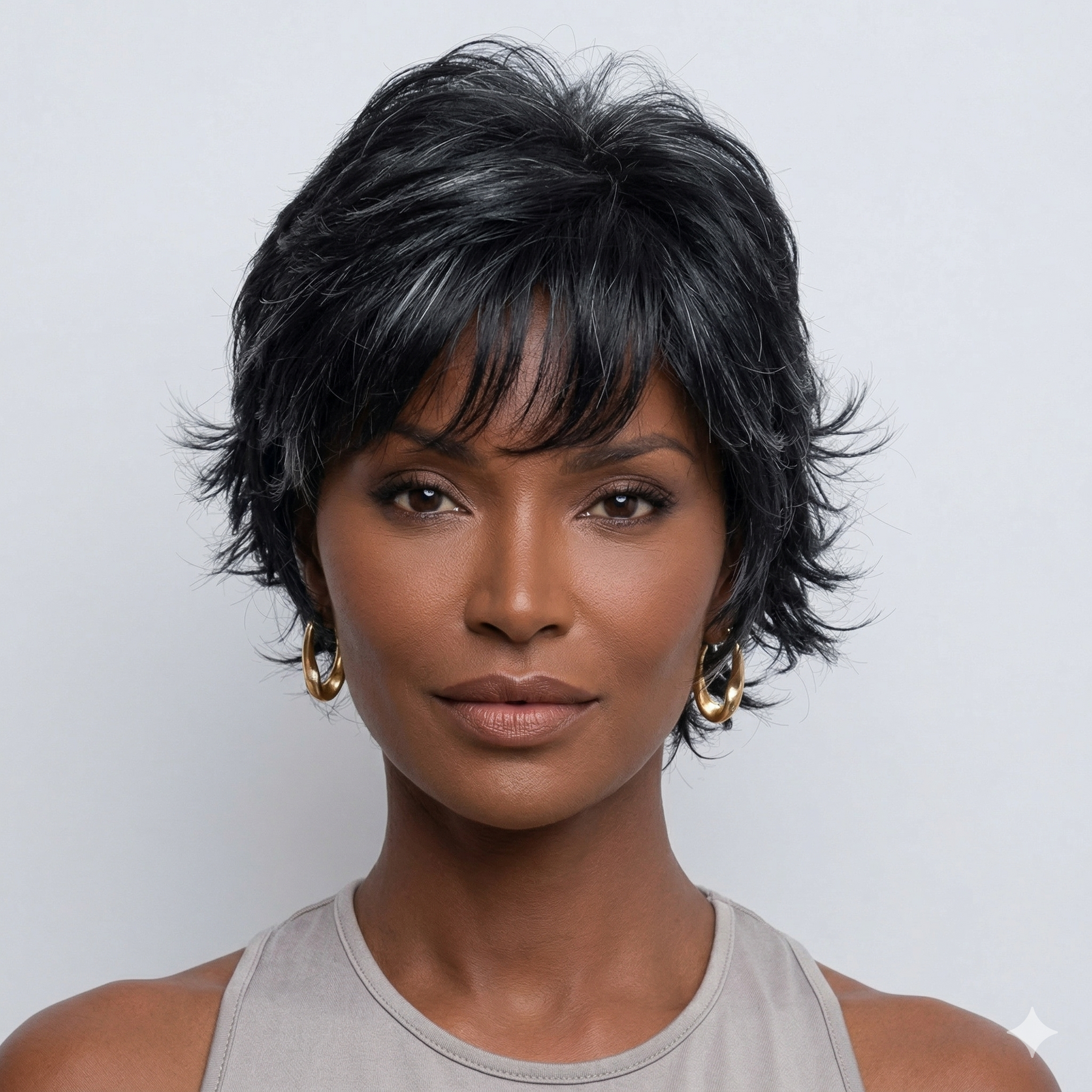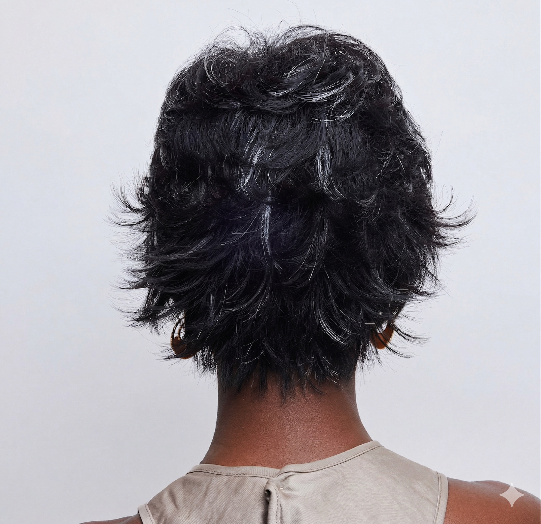 Nour from our Noriko Collection is a short-length synthetic wig. This straight ready-to-wear wig is short pixie style. With it’s flips texture, Nour is fun and feminine to wear. Nour is machine made with adjustable tabs in the back nape area to allow a more comfortable fit. The result is a comfortable fit with a natural look that is both fashionable and easy to wear.
