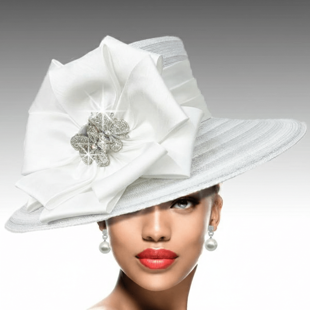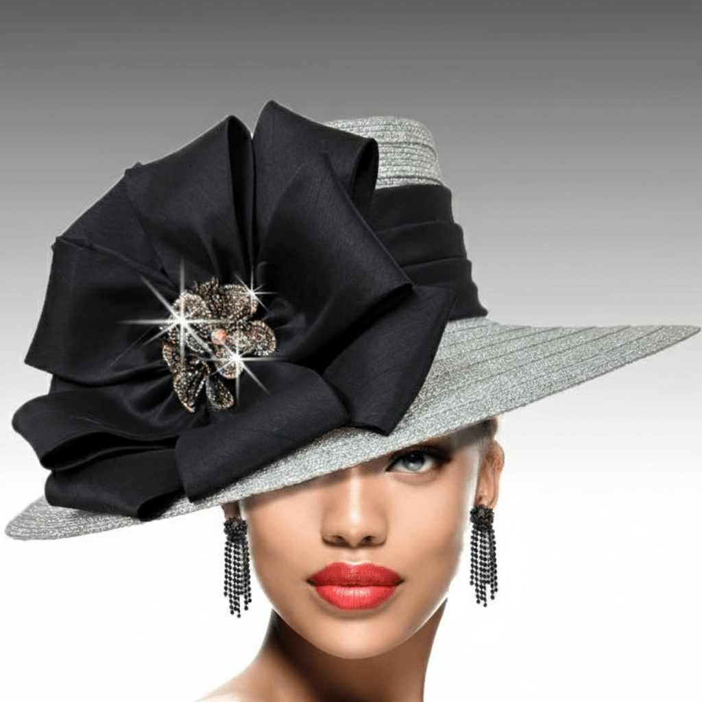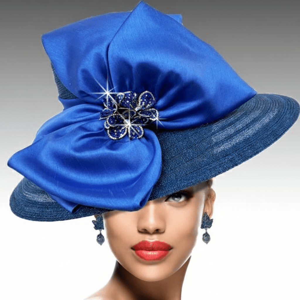 A sharp tailored hat is appropriate for all occasions. The 4.5″ brim and 4.5 ” square crown create a classic silhouette, which is softened by our gracious bow and crystal flower. This is the perfect hat to be worn year round to any special occasion. An adjustable sweat band allows for varying head sizes.