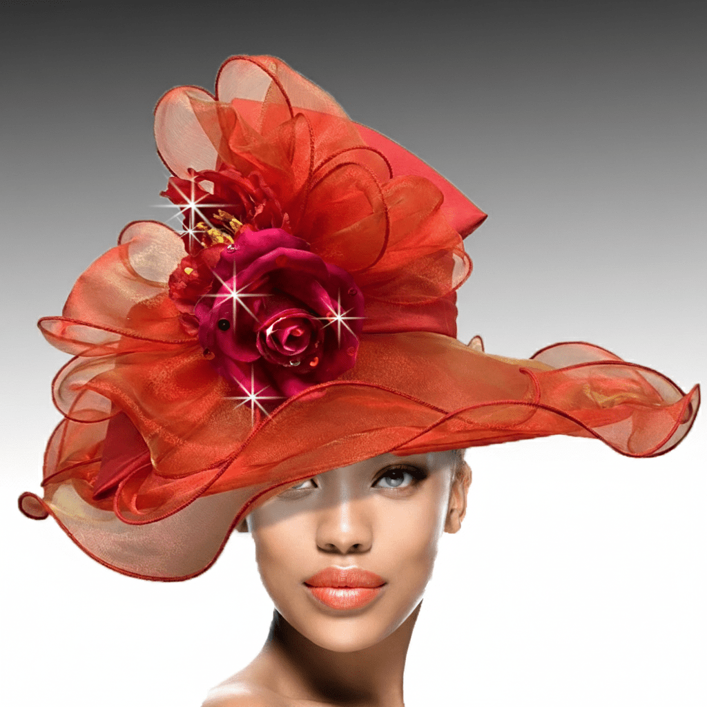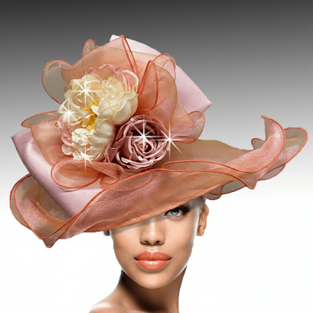 Our feather weight organza hat captures the graceful ballet of the delightful hummingbird. Iridescent layers of organza, multi hued flowers and tonal feathers grace this masterful headpiece that is sure to capture audiences at any event including the Derby, a wedding or any special occasion. The hat’s light weight and its adjustble sweatband assure a comfortable and secure fit.