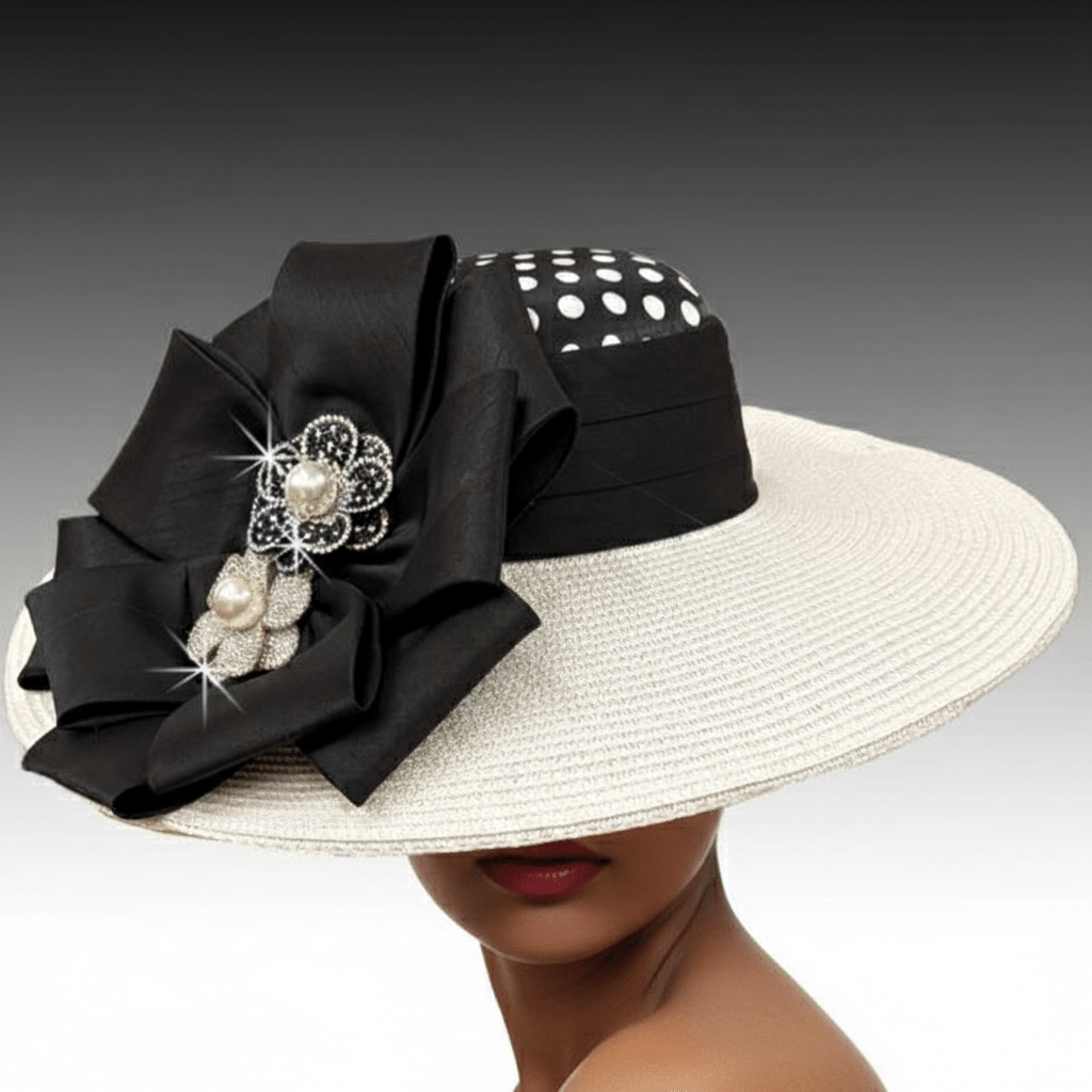 For those ladies that seek a sharp tailored silhouette, there is no better hat than this cartwheel hat with its 5.5″ brim. The crown is covered in optic black and white polka dots. A draped band ends with a slick 12 point bow whose center is highlighted 2 a duo of sparkling crystal camelias. The adjustable sweatband allows for different head sizes.