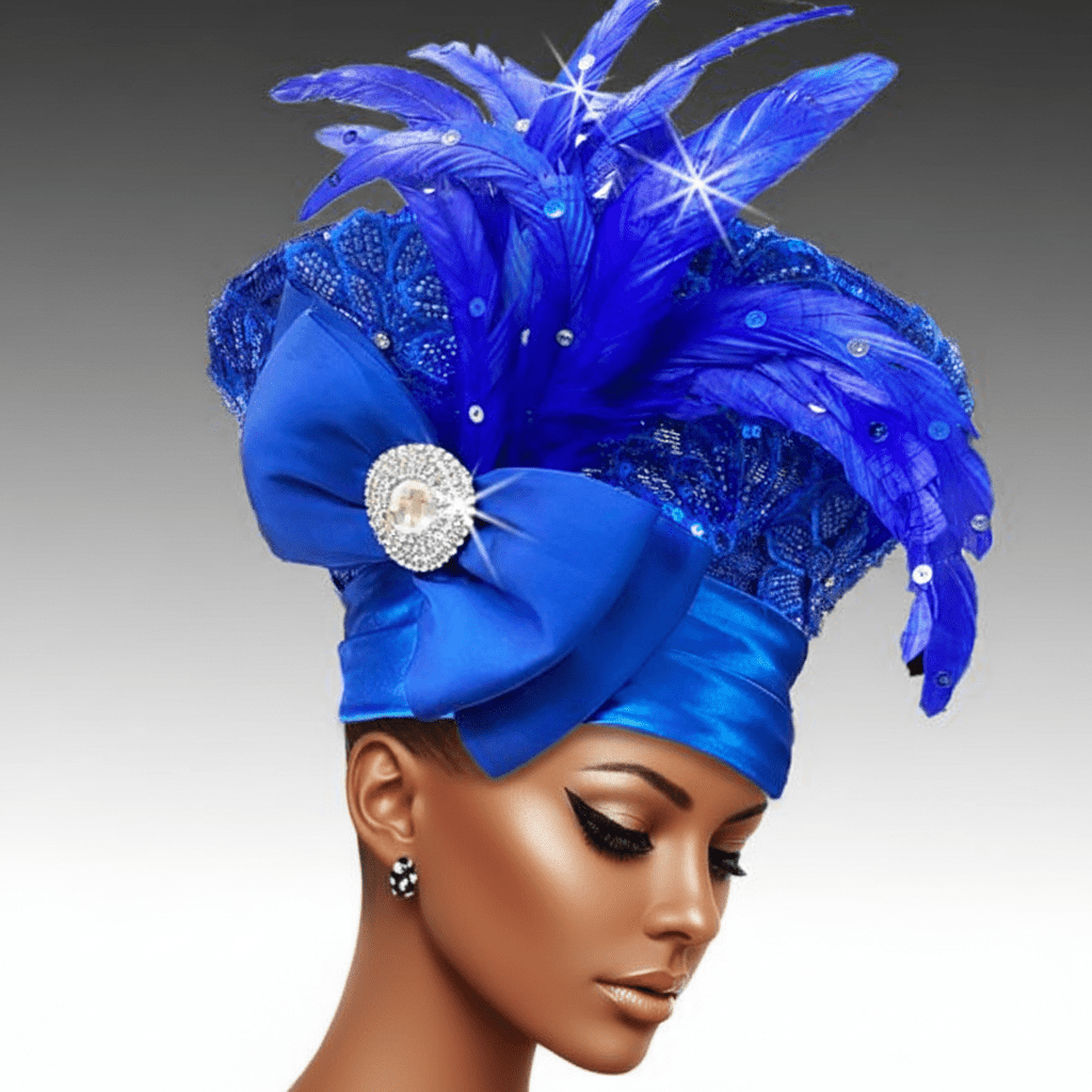 Babylonia is a dazzling masterpiece that features a sleek, sculpted base entirely draped in intricate beaded lace embroidered with shimmering beads and crystals. Rising majestically from one side is a flourish of long, graceful feathers that fan out elegantly from a base of a bow and crystal brooch. The adjustable sweatband allows for varying headsizes.