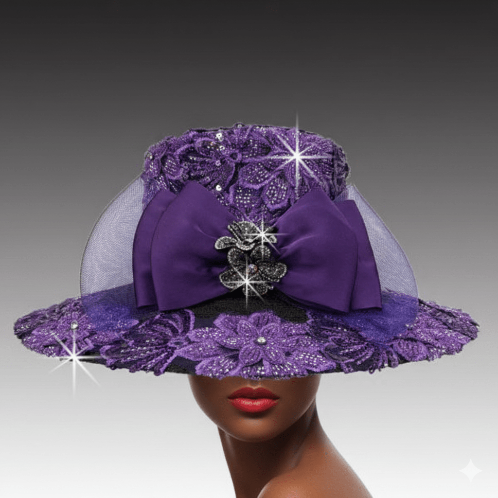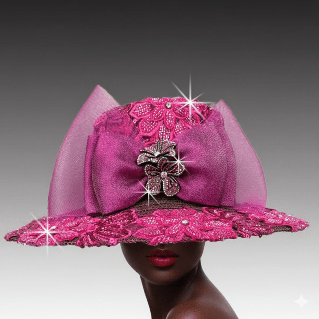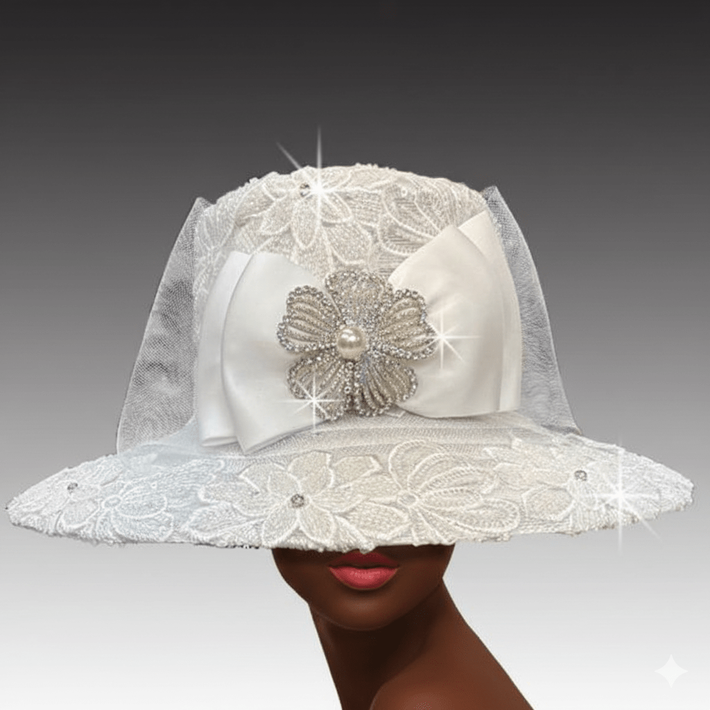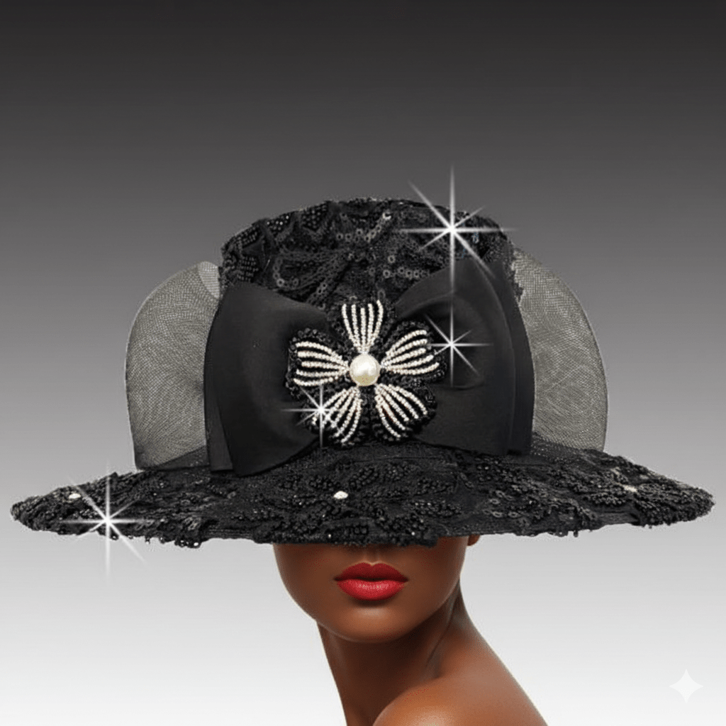 This elegant flat crown hat features a luxurious 5″ brim, delicately framed with intricate hand-beaded lace. The same exquisite lace envelops the entire crown, giving it a regal touch. The hat’s striking silhouette is further enhanced by the lavish front bow adorned with a jewel-encrusted floral brooch. The bold yet graceful design blends elegance and femininity.