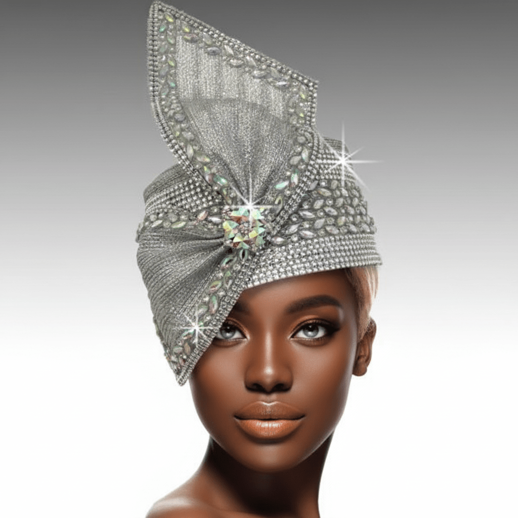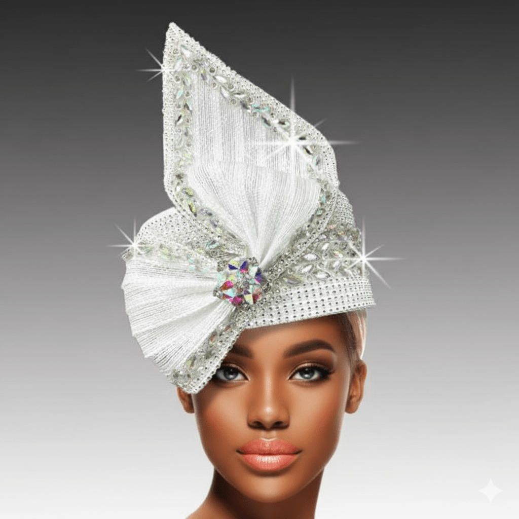 A breathtaking pillbox hat that exudes architectural elegance and divine beauty. The sides are entirely encrusted with iridescent jewels, reflecting light in a dazzling display. Rising above is a high, sculptural bow inspired by the soaring spires of a grand cathedral. “STEEPLE” is perfect for occasions where making an unforgettable statement is essential. The adjustable sweatband allows for different head sizes.