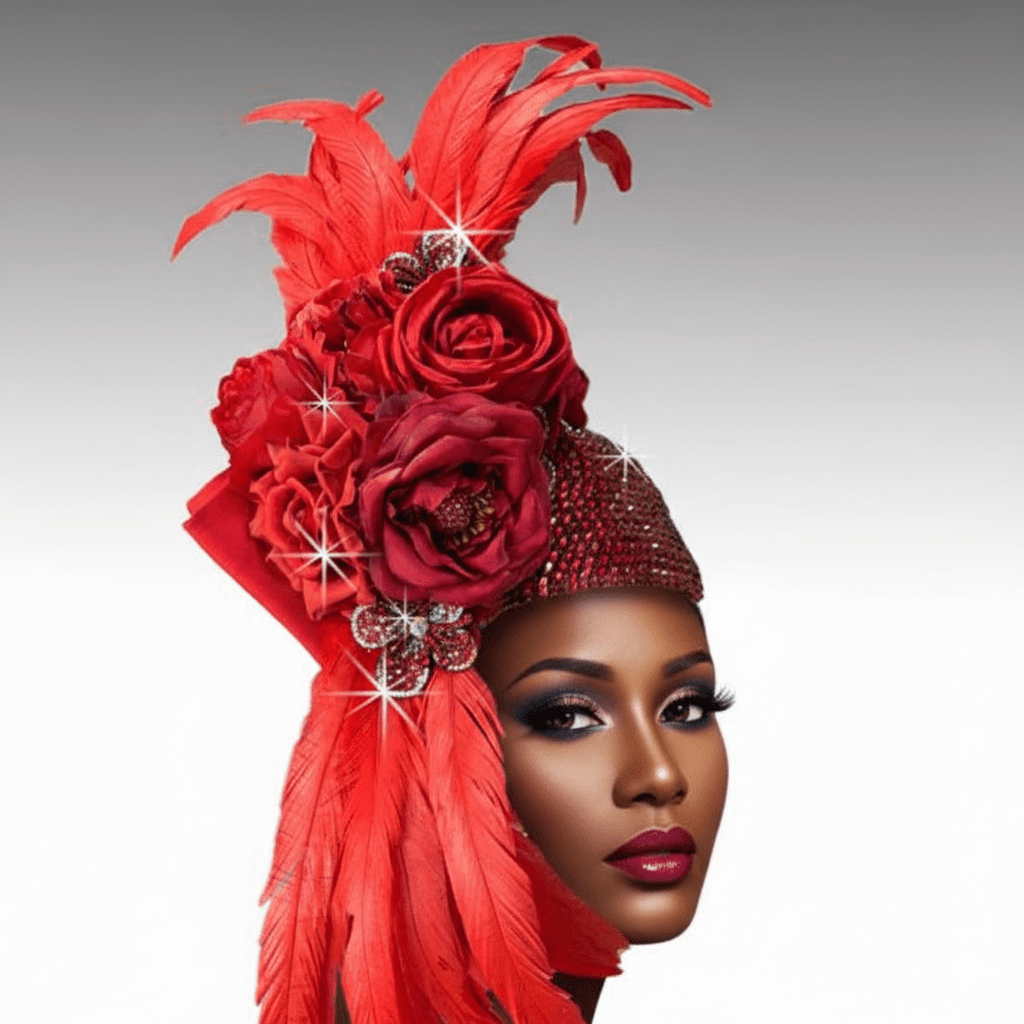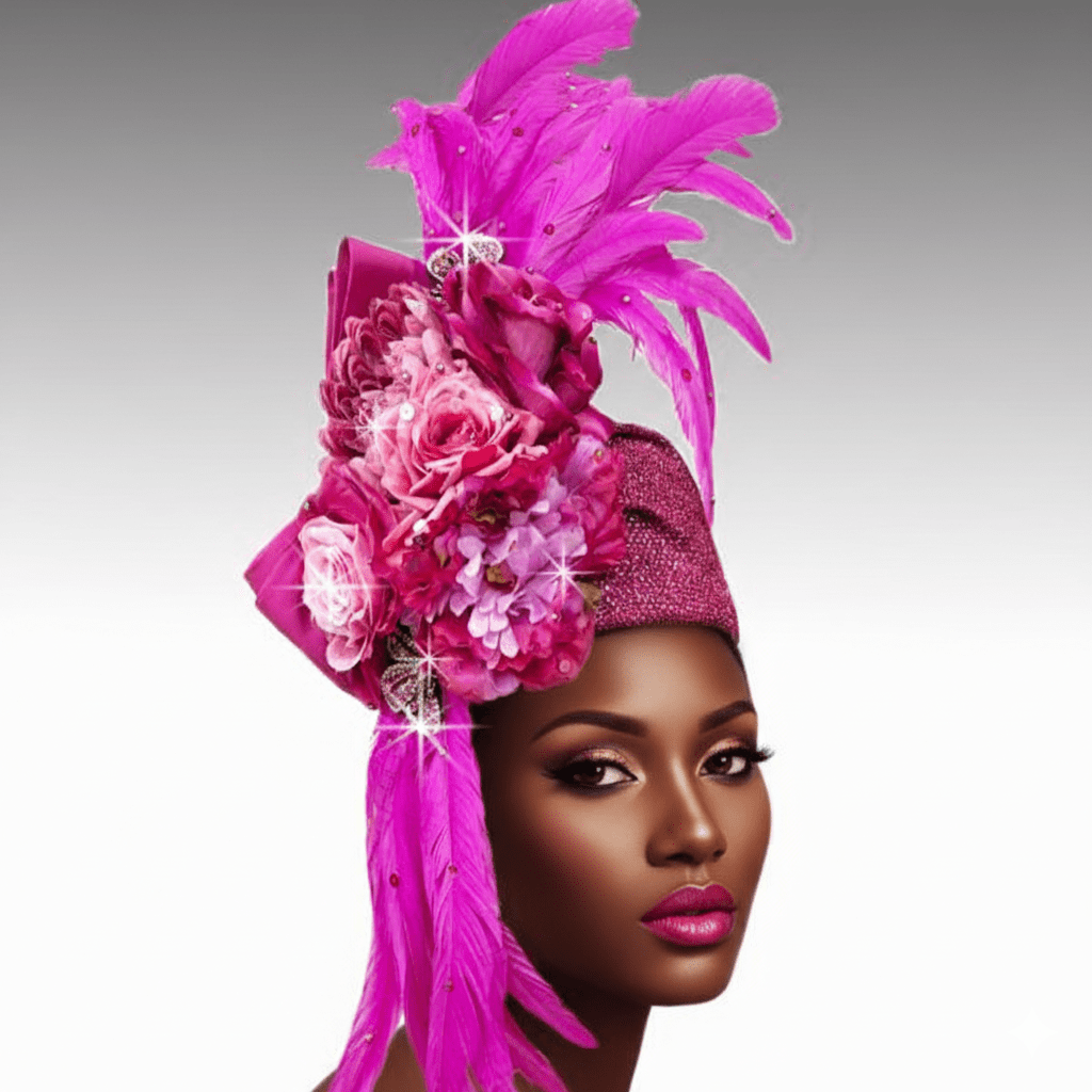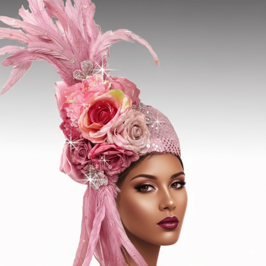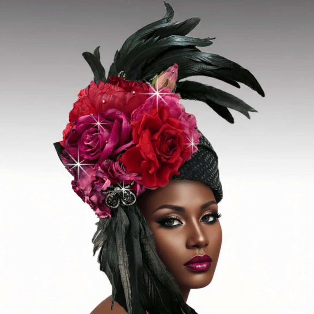 Adele is a radiant fusion of glamour and drama. This crystal-laden bubble hat gleams like a constellation. Crowning the piece is a bold corsage of feathers, silk flowers, and rhinestone-studded blooms — a sumptuous arrangement that bursts forth in dynamic asymmetry. Strategically placed to one side of the bubble, the corsage creates a striking silhouette that everyone will notice– a true entrance maker!