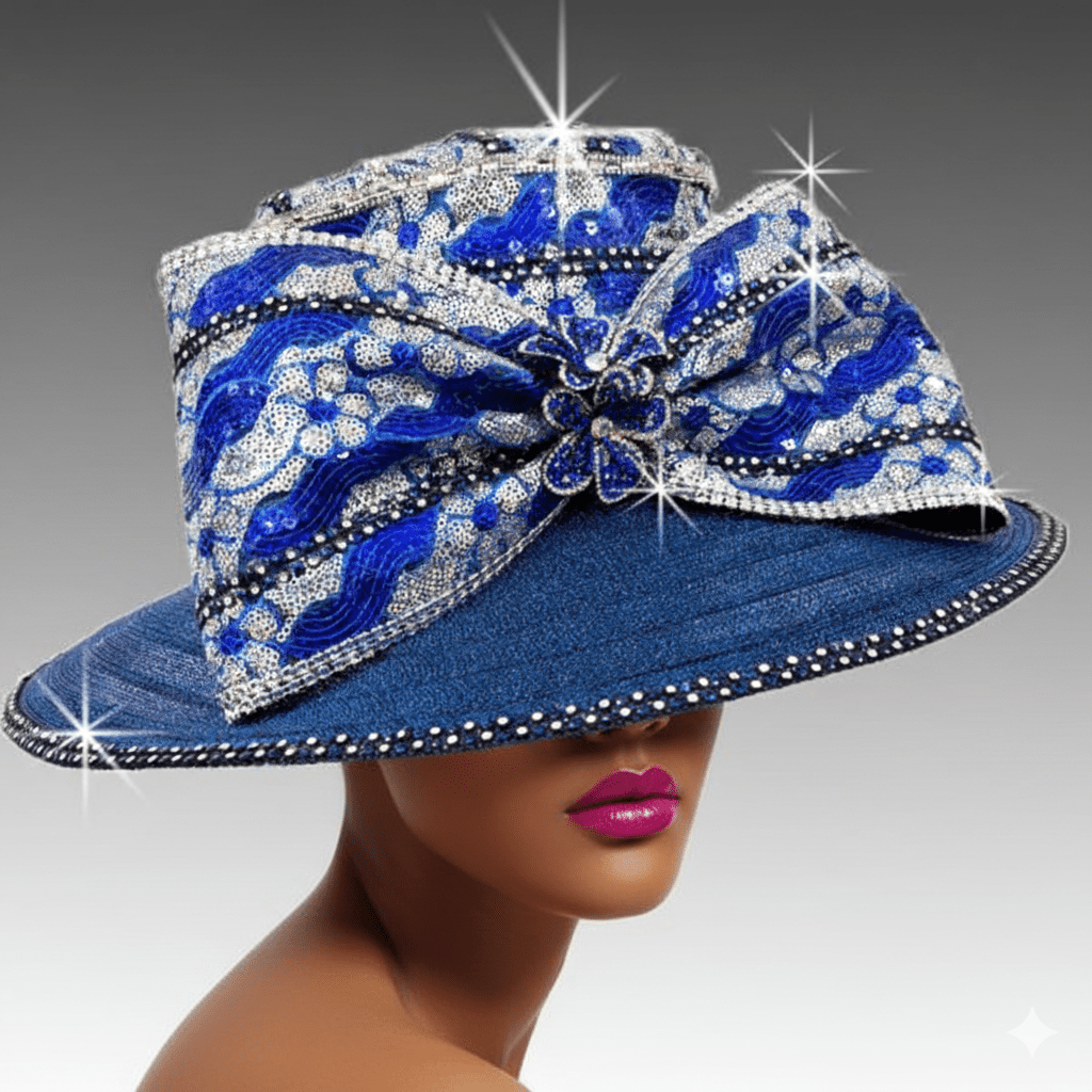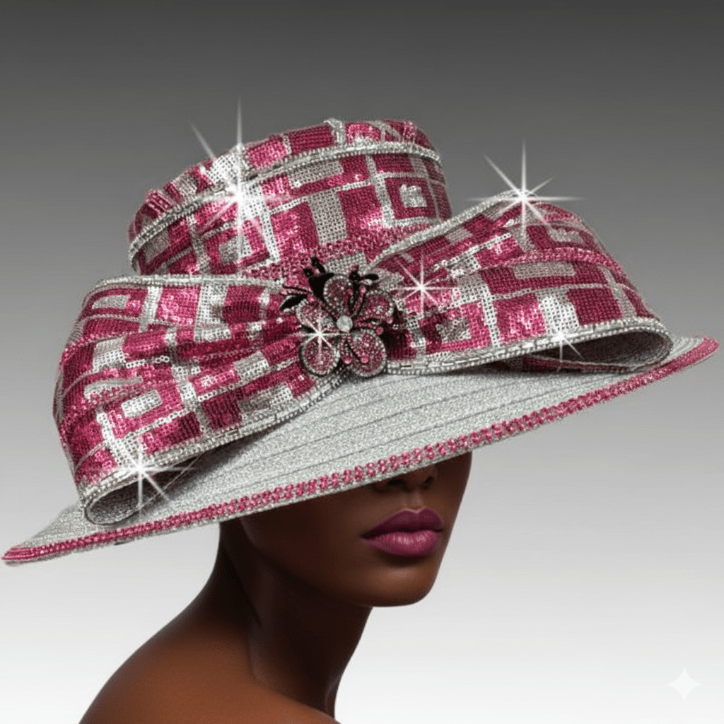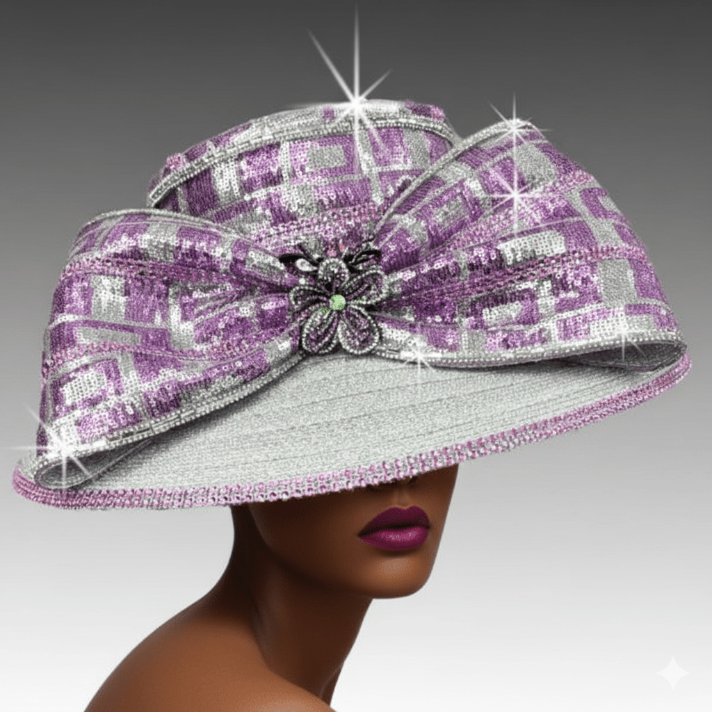 LILY is the embodiment of elegant serenity. Its 4.5-inch silver brim gracefully frames the face, while the crown, blanketed in glistening sequins, radiates understated glamour.Delicate strips of crystals and micro mirrors encircle the crown. At the heart of this design, a large, dramatic bow—crafted from the same sparkling sequins—becomes the centerpiece, adorned with a crystal pavé bloom. Hat is 18 inches in diameter and approximately 8 inches in height.