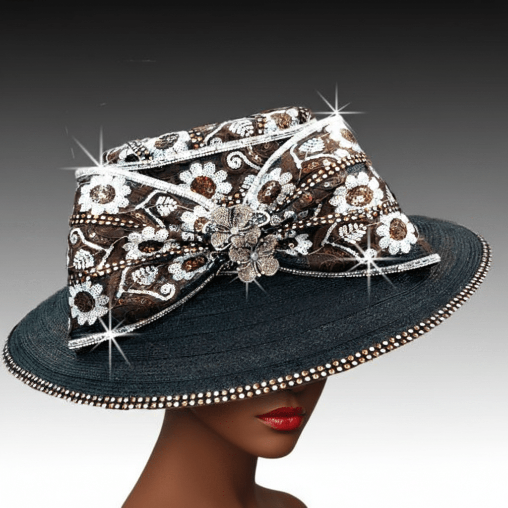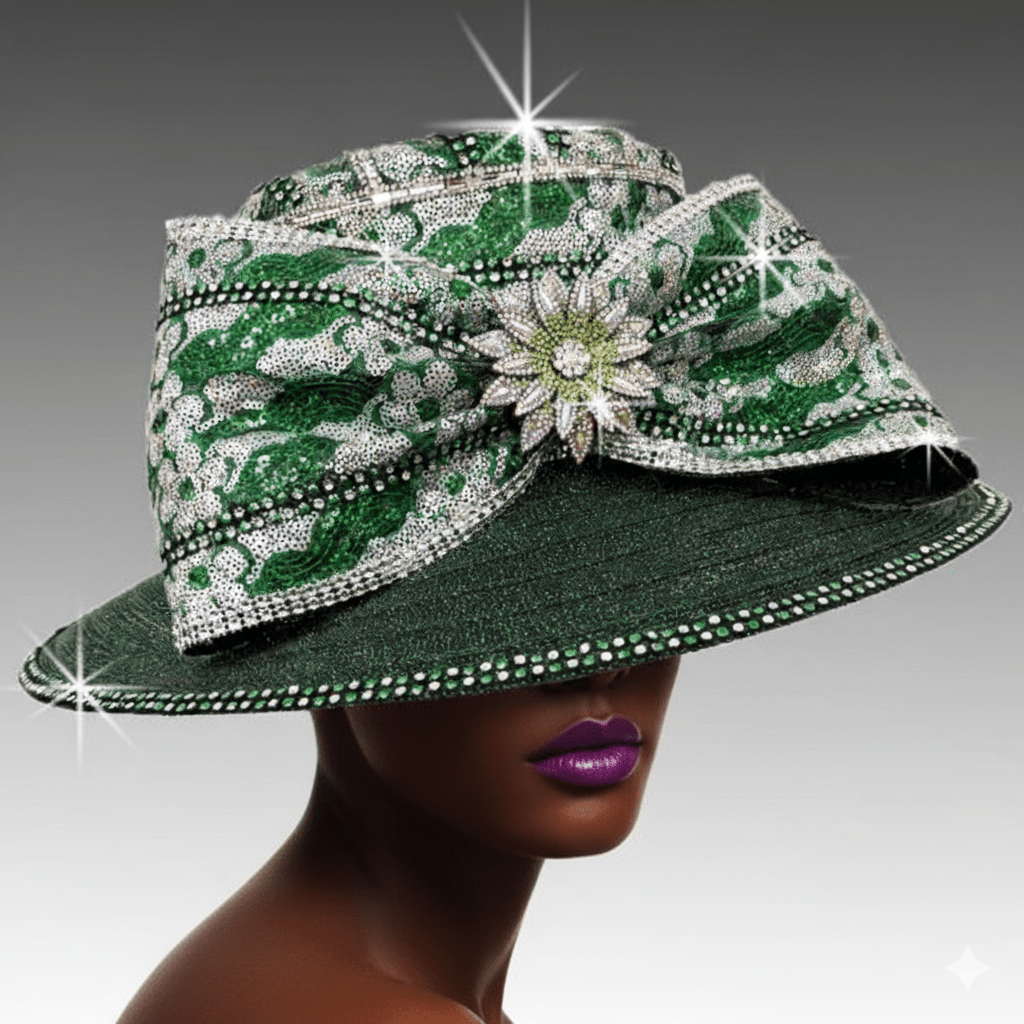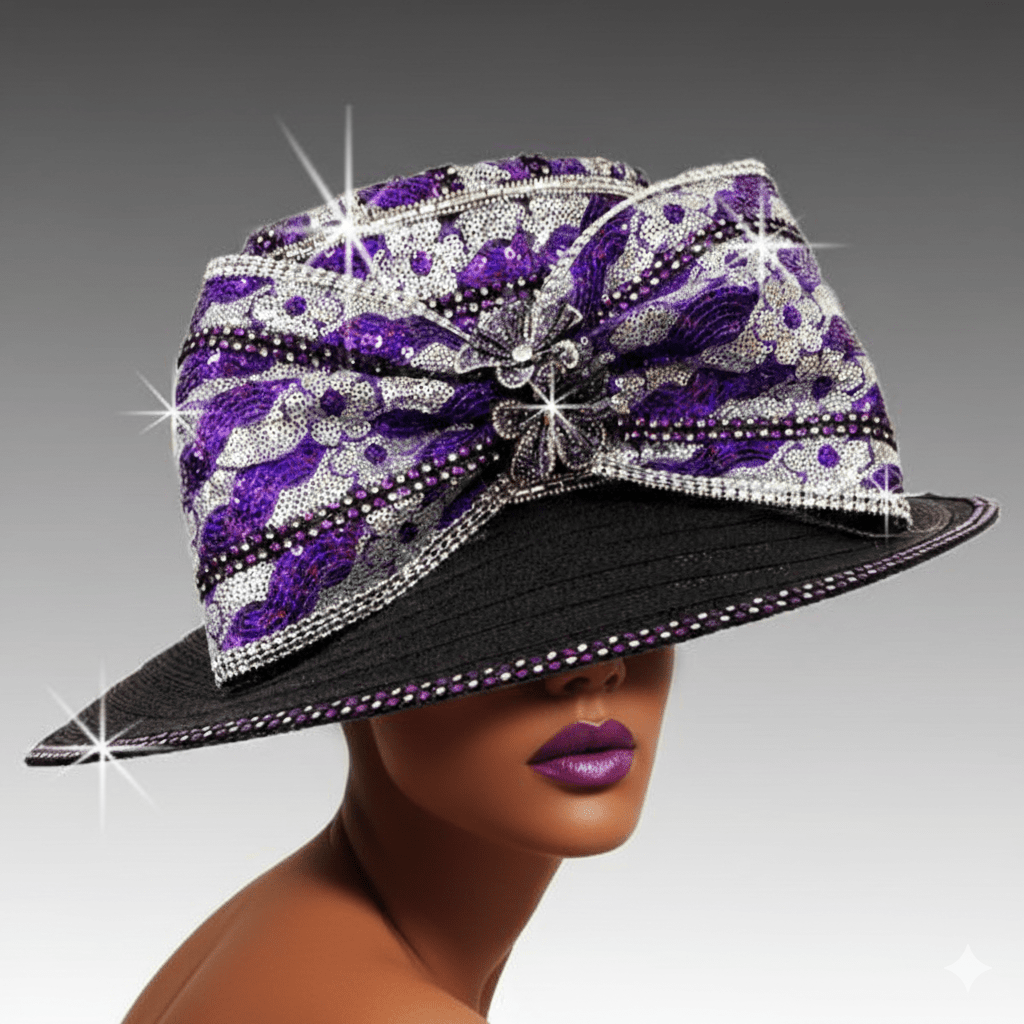 LILY is the embodiment of elegant serenity. Its 4.5-inch silver brim gracefully frames the face, while the crown, blanketed in glistening sequins, radiates understated glamour.Delicate strips of crystals and micro mirrors encircle the crown. At the heart of this design, a large, dramatic bow—crafted from the same sparkling sequins—becomes the centerpiece, adorned with a crystal pavé bloom. Hat is 18 inches in diameter and approximately 8 inches in height.
