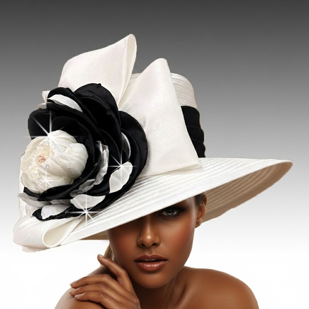 Robin is a true embodiment of understated elegance and timeless style. Its tailored silhouette is achieved through the flat crown ( 5″ high) and crisp geometric brim (4.5″). At the heart of the hat, a dramatic bow holds a luxurious bloom, adding a touch of opulence and soft femininity. This hat is perfect for a wedding, the Derby, or any special occasion. The sweatband is adjustable