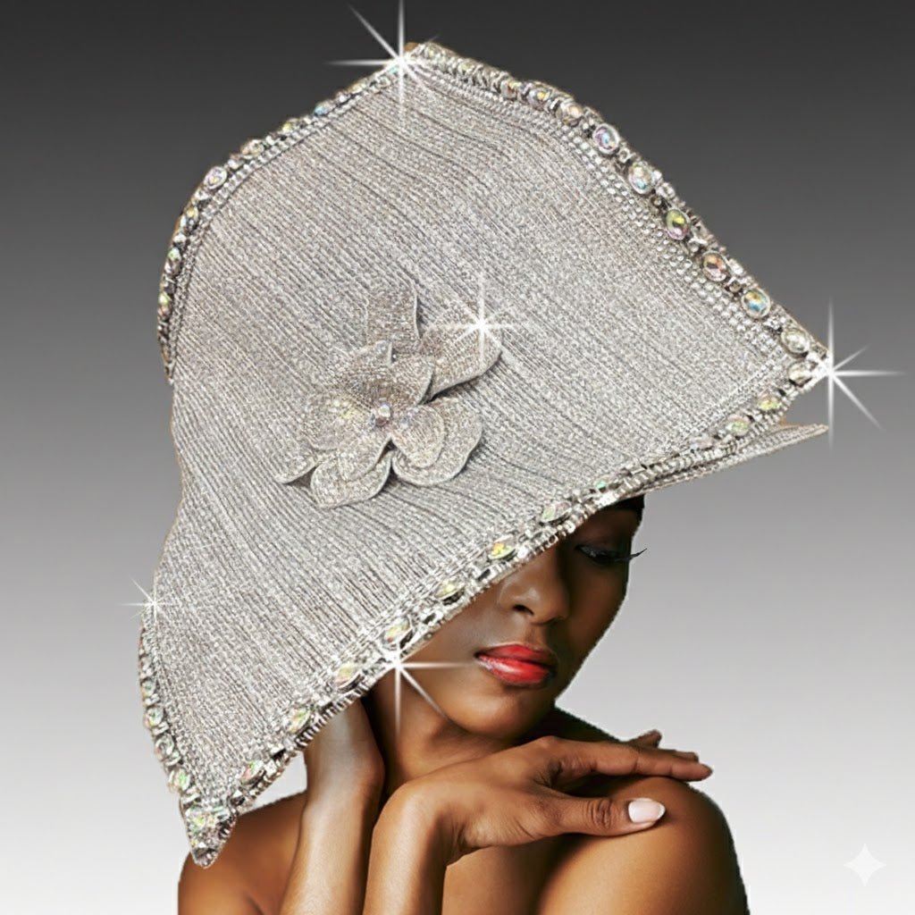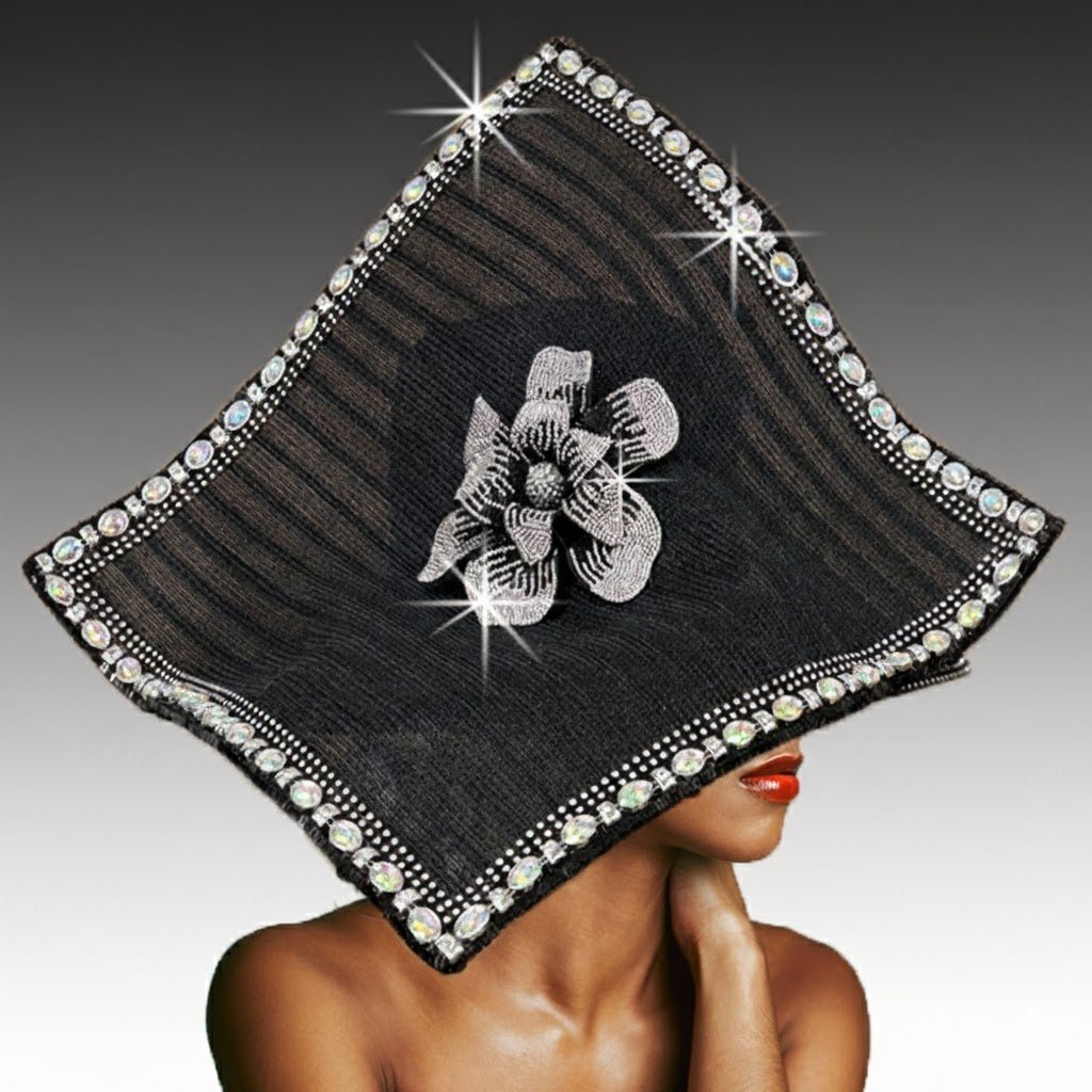 Isabella is a dramatic fashion statement. A classic square crown with a 4.5″ brim is the backdrop for a square canvas framed in sparkling stones and set artistically to create a most flattering silhouette. The focal point is a sparkling flower meticulously encrusted in miniature crystals that capture light at every movement. The adjustable sweatband allows for varying head sizes.