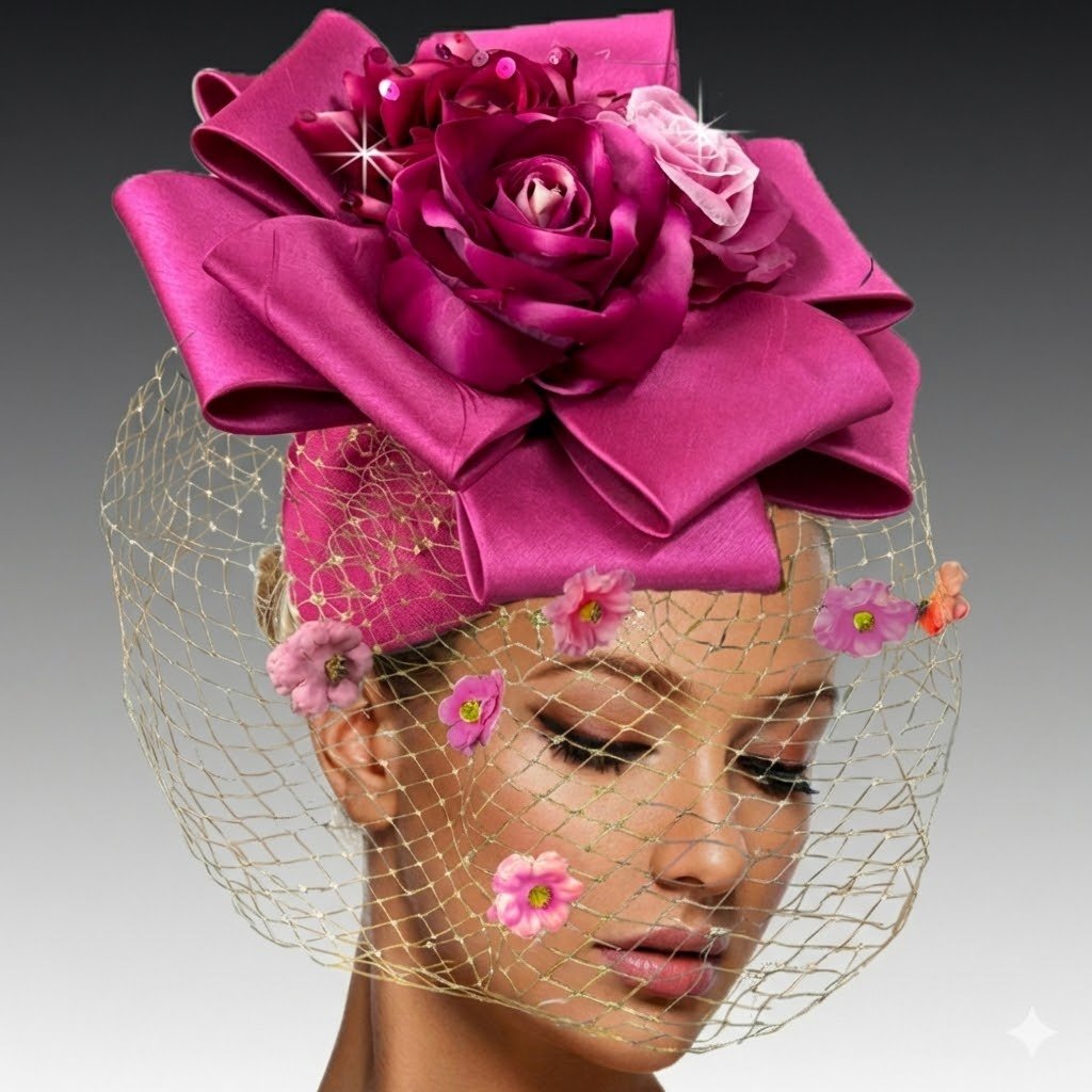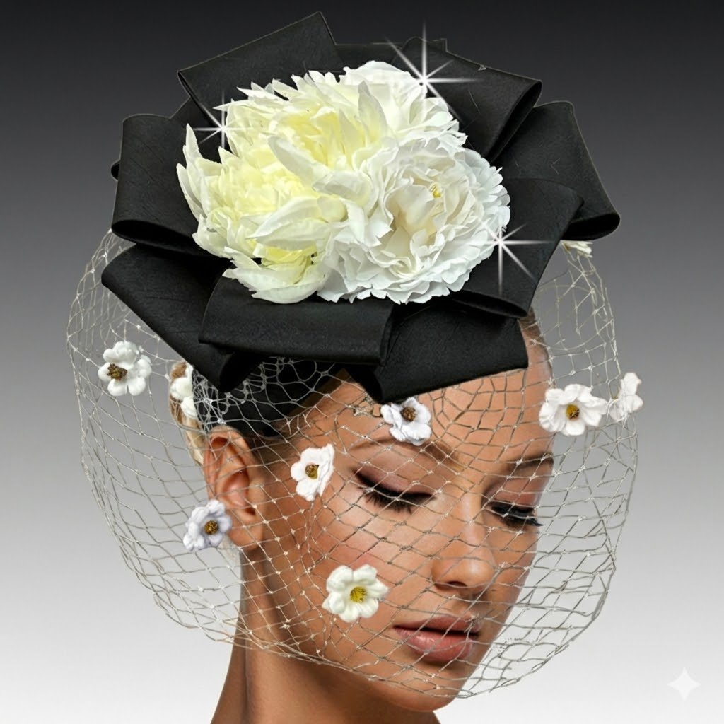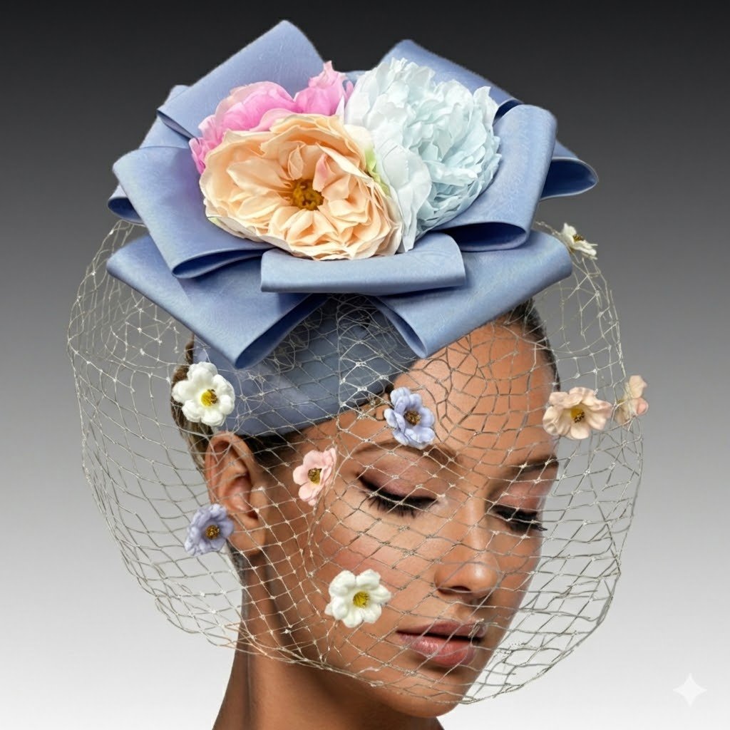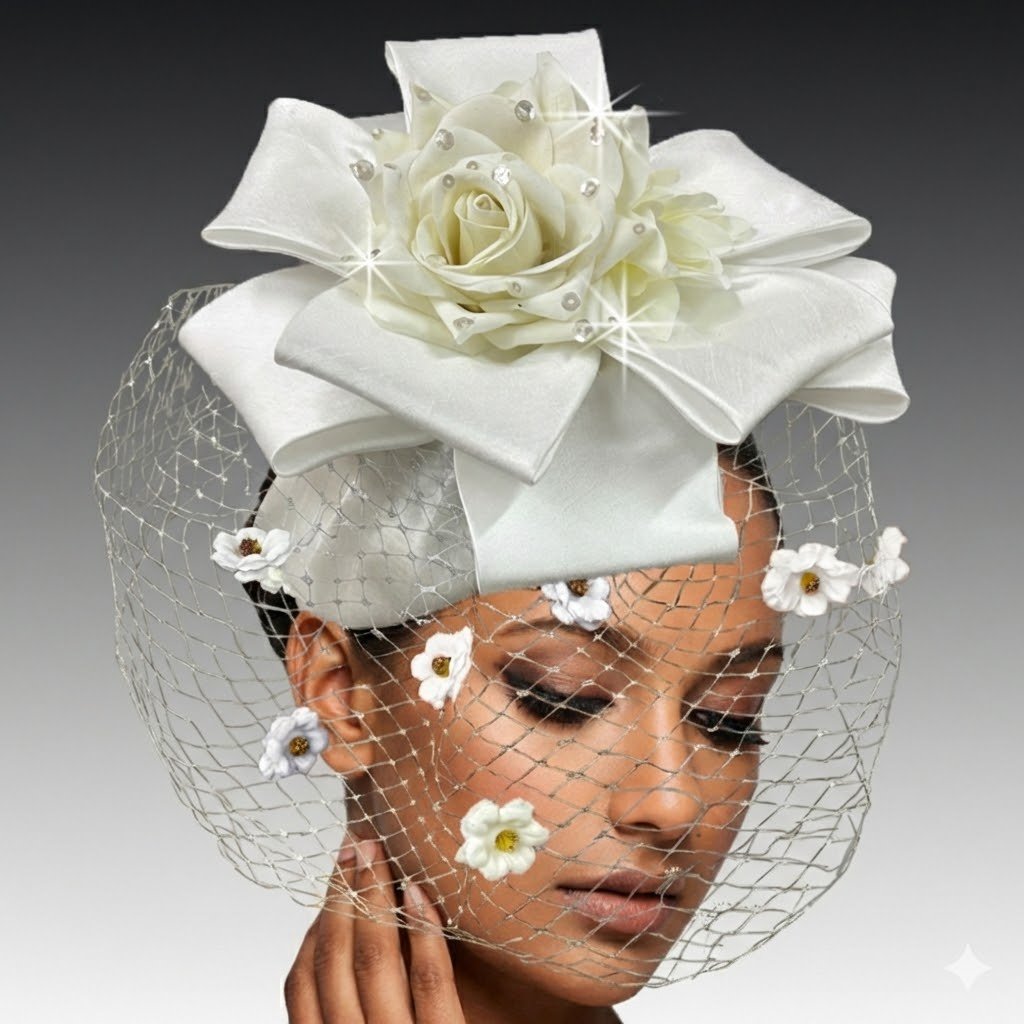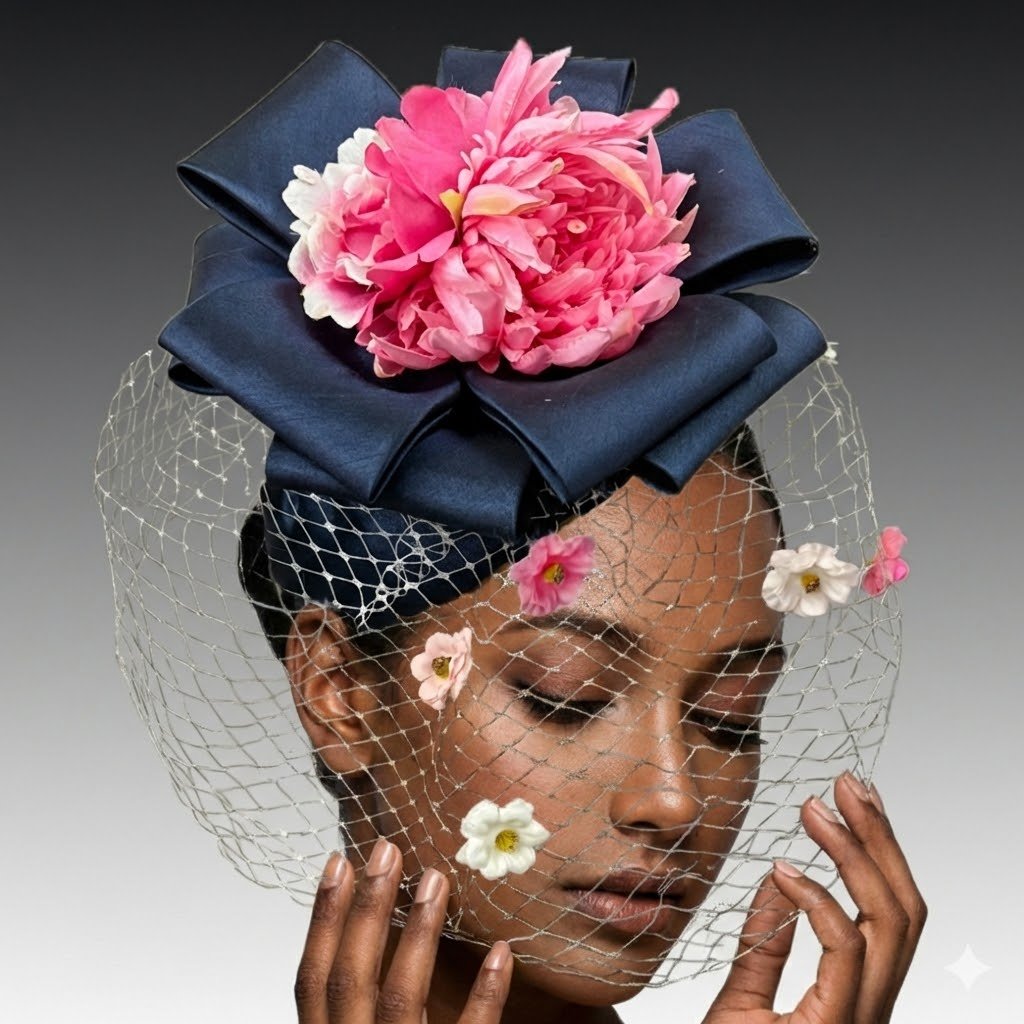 The CACHE fascinator is a masterfully draped Juliet cap that sits delicately on a headband. Atop the cap, a multi-point bow forms a dramatic centerpiece, cradling a luxurious bouquet of flowers. A delicate veil gracefully sweeps across the face, gently kissed with mini blooms for a soft, ethereal effect. This fascinator is perfect for those seeking a touch of vintage glamour with a modern twist.