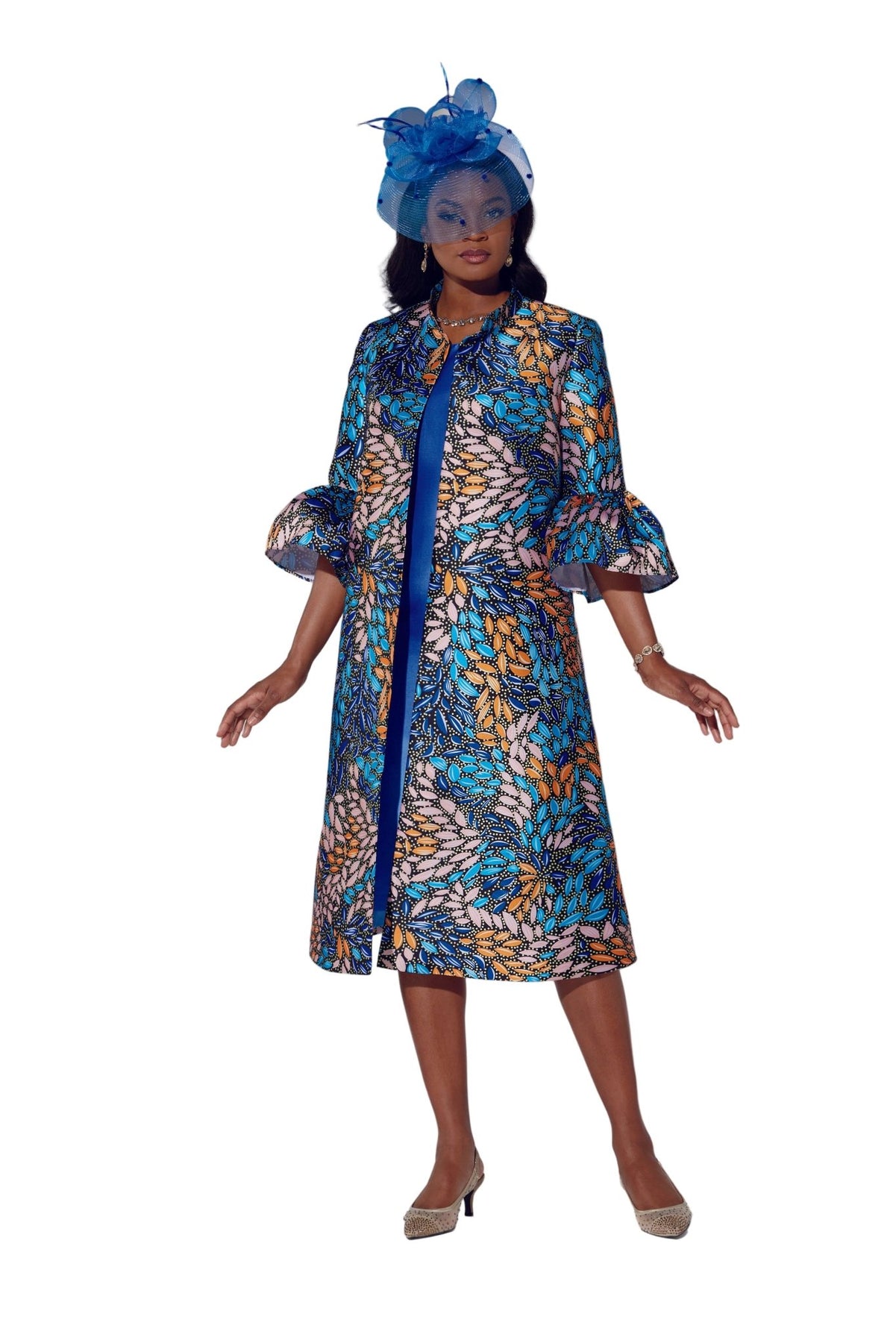 Two-piece Marvelous Mosaic Jacket Dress set beautifully combines a bold mosaic print with a sophisticated solid, all in a luxurious, rich fabric. The ensemble features a gorgeous 47-inch open jacket with a chic stand collar and eye-catching ruffled flounce sleeves. The coordinating sleeveless 42-inch dress is designed to flatter, with shaping darts and a back neck zipper for a perfect fit.