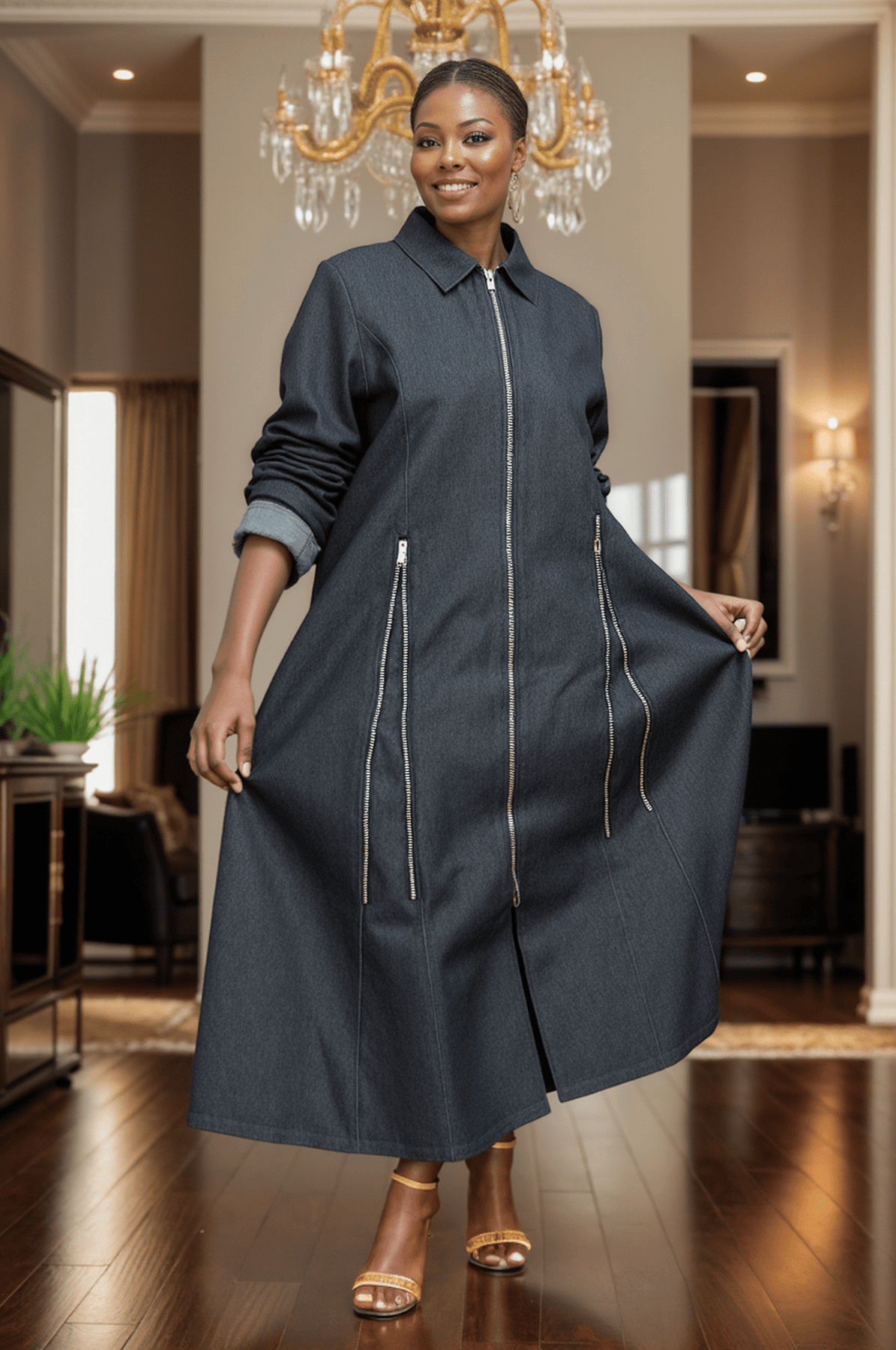 This ankle-length denim dress, crafted from 85% cotton and 15% polyester, provides both comfort and a refined appearance. Featuring long sleeves and zippered design that merges functionality with sophisticated design, making it perfect for daily wear while showcasing cultural elegance. Made with high quality Denim that will keep you warm.