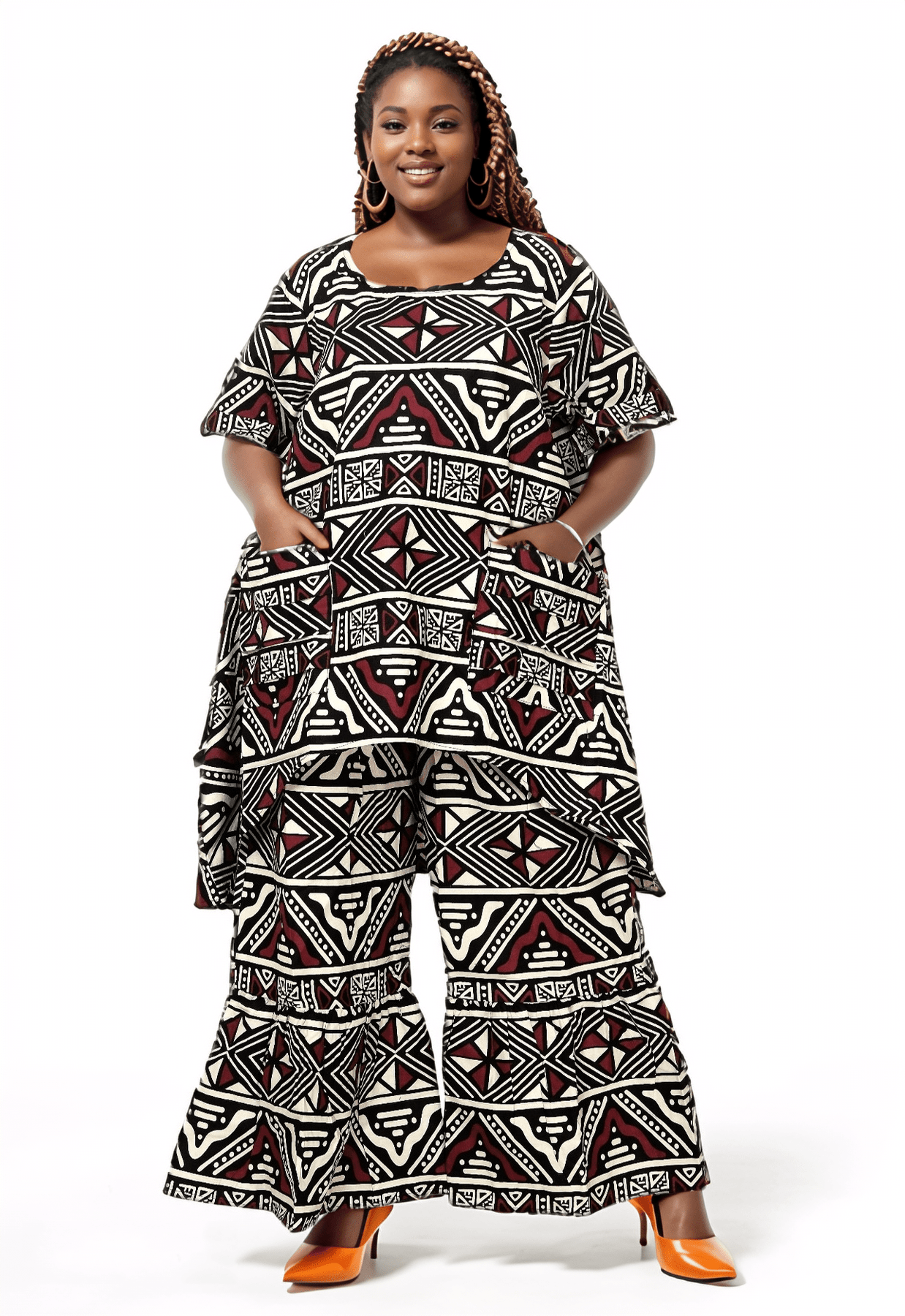 Crafted from 100% African Wax Cotton, and featuring beautiful all-over prints and short sleeves. This Pull-on Top and Pant Set is sure to enhance any wardrobe. Two side pockets and a head-wrap provide a practical yet stylish finish, and a one size fits most design adds versatility.