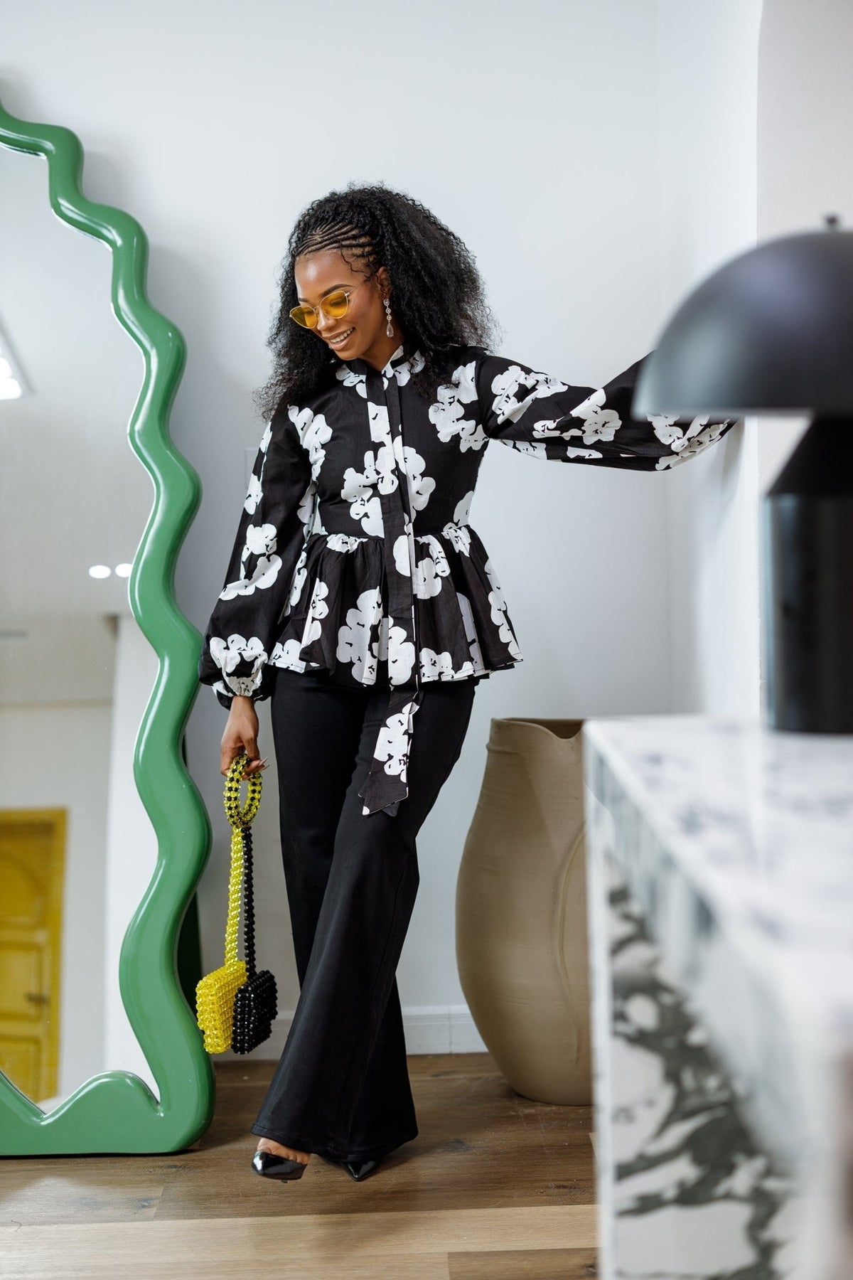 Bring bold elegance to your wardrobe with our African Print Tie-Neck Peplum Top, designed to make you feel every bit the Queen you are. Crafted from premium African wax cotton, this vibrant top features a flattering peplum silhouette, dramatic puff sleeves with elastic cuffs, and a stylish tie-neck bow that adds a sophisticated, feminine touch.