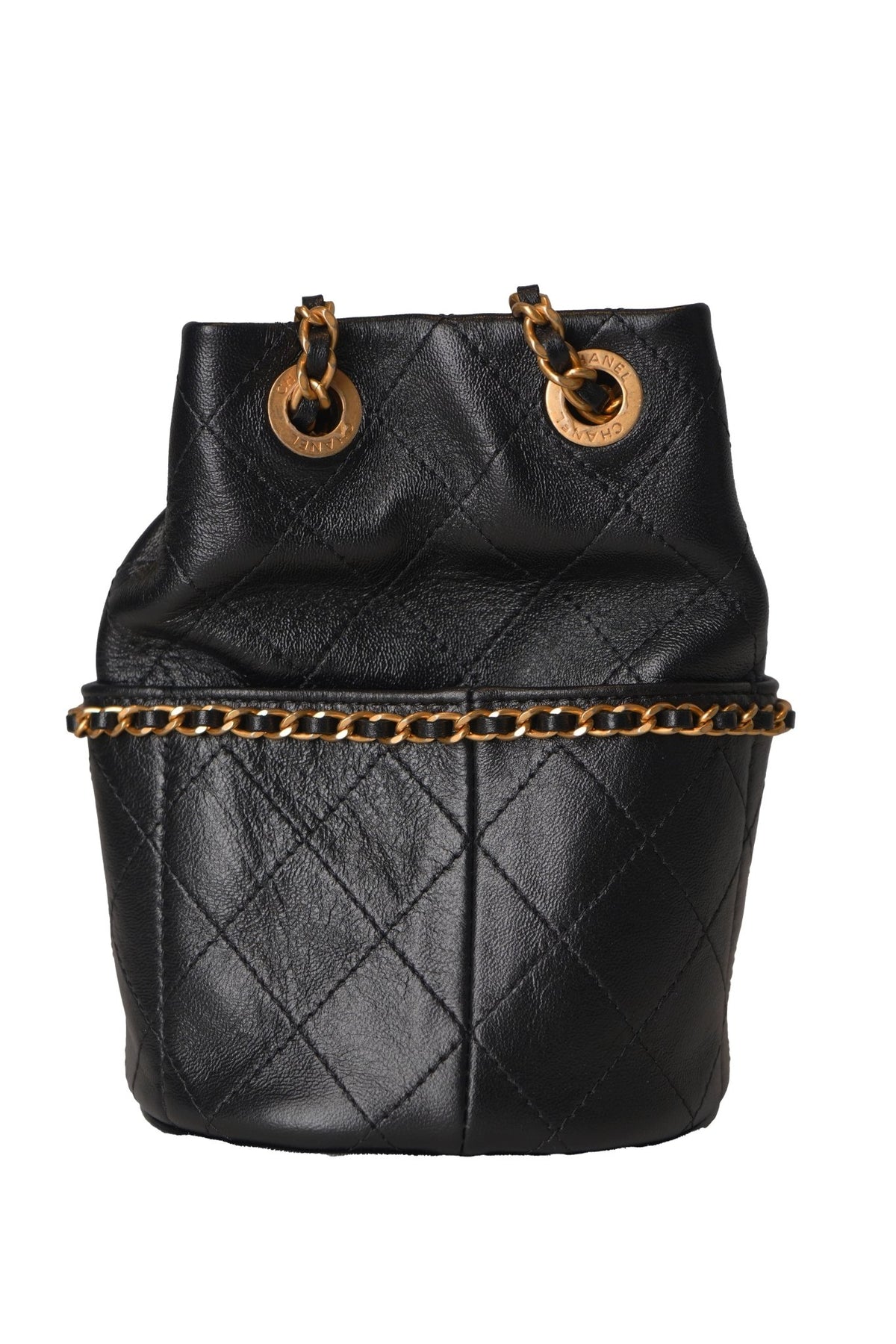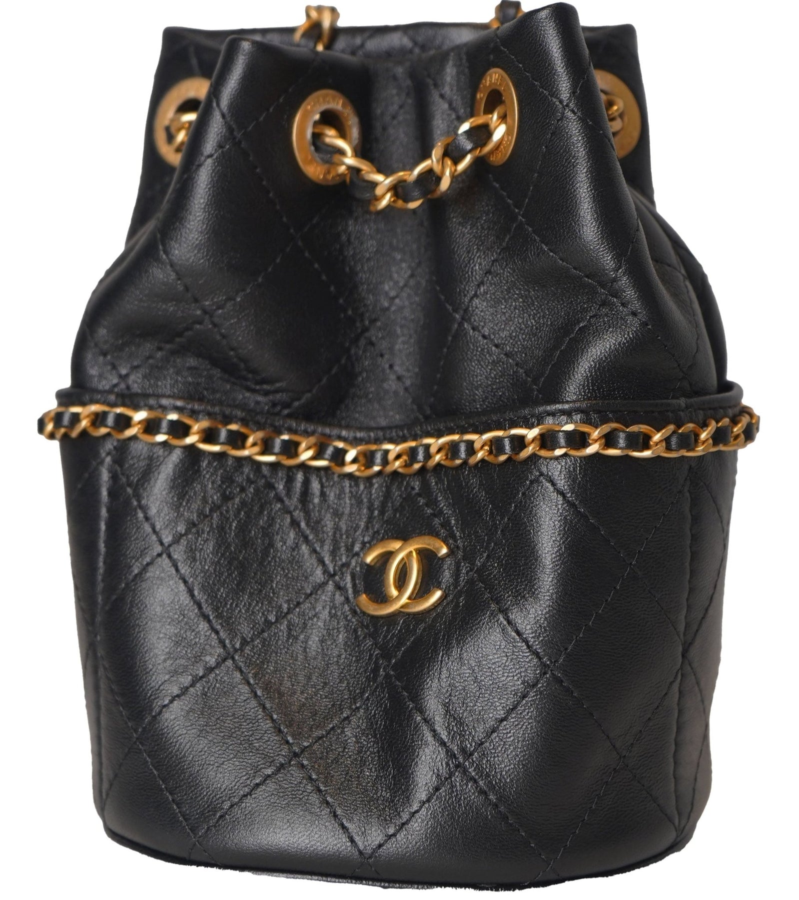 This is an authentic CHANEL Shiny Lambskin Quilted Chain Is More Drawstring Bag in Black. This stylish handbag is crafted of diamond-stitched lambskin leather in black. The bag features a chain top handle, a gold chain leather threaded shoulder strap, and a gold CC logo. The top is open to a blue fabric interior with a patch pocket.
