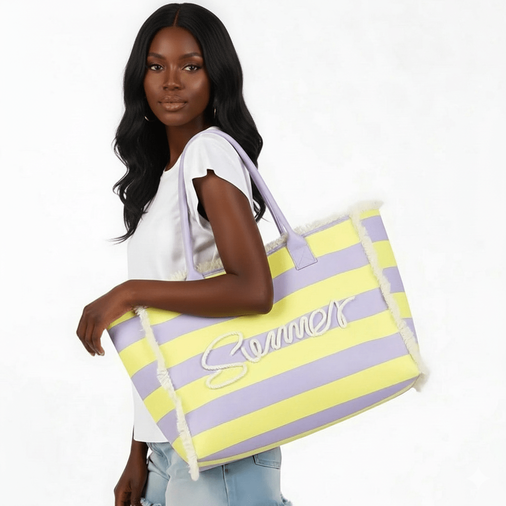 • Stylish tote bag featuring bold horizontal stripe design with textured fringe trim and raised script lettering detail. Designed for everyday carry, travel, shopping, or seasonal gifting. A trendy statement accessory that blends function with eye-catching design.