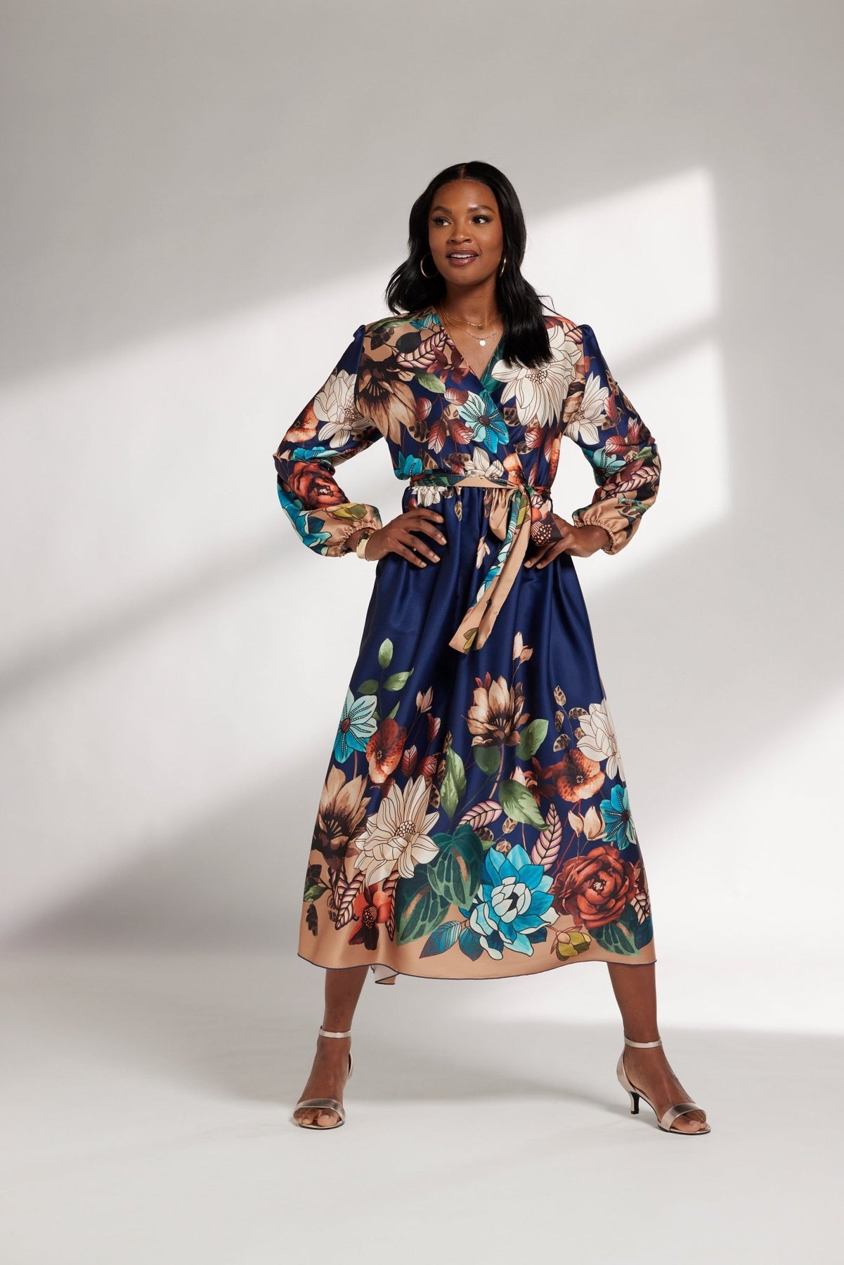 Blooming Flowers Wrap Dress by Studio EY — A bed of satin florals on a totally twirl-worthy midi. A-line dress delivers timeless fit-and-flare styling for elevated ease. Gently puffed shoulders, long sleeves with elasticized cuffs for refined coverage. Flattering surplice bodice. Self-tie sash defines the waist. A fab day-to-night dress, whatever your social calendar plans. Embrace your personal style and radiate confidence with our fashion-forward designer dresses for ladies. Ideal for garden parties, casual brunches, showers and many more special occasions. Perfect anytime you want to look and feel your best. Expect compliments along the way. On-trend look from our exclusive collection of Especially Yours dresses. At EY, we are committed to offering African American women the best in high-quality fashions at affordable prices. Especially Yours clothing offers Black women so many ways to express their beauty, heritage and faith. Love it? Simply click “Add to Cart”.