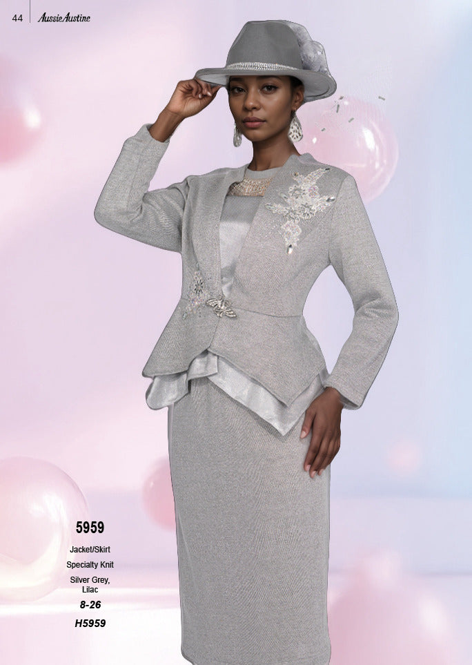 Elite Champagne 6157-SV Elegant Silver Skirt Suit with Lace Brocade