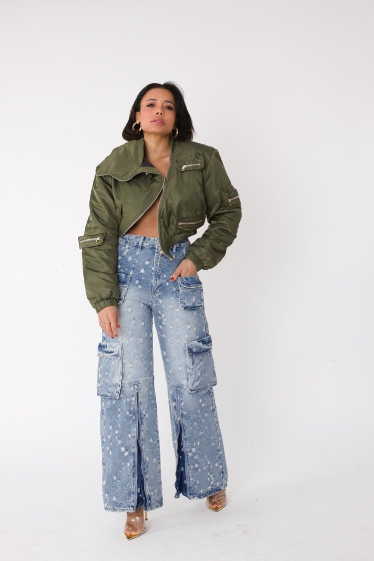 Elevate your style with our signature cropped utility bomber jacket in rich olive. Featuring premium zipper details and a modern silhouette, this versatile piece combines urban edge with feminine appeal.