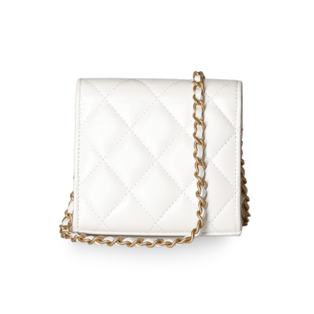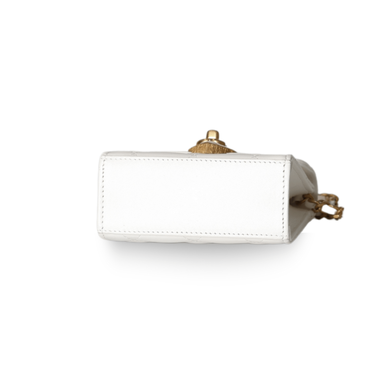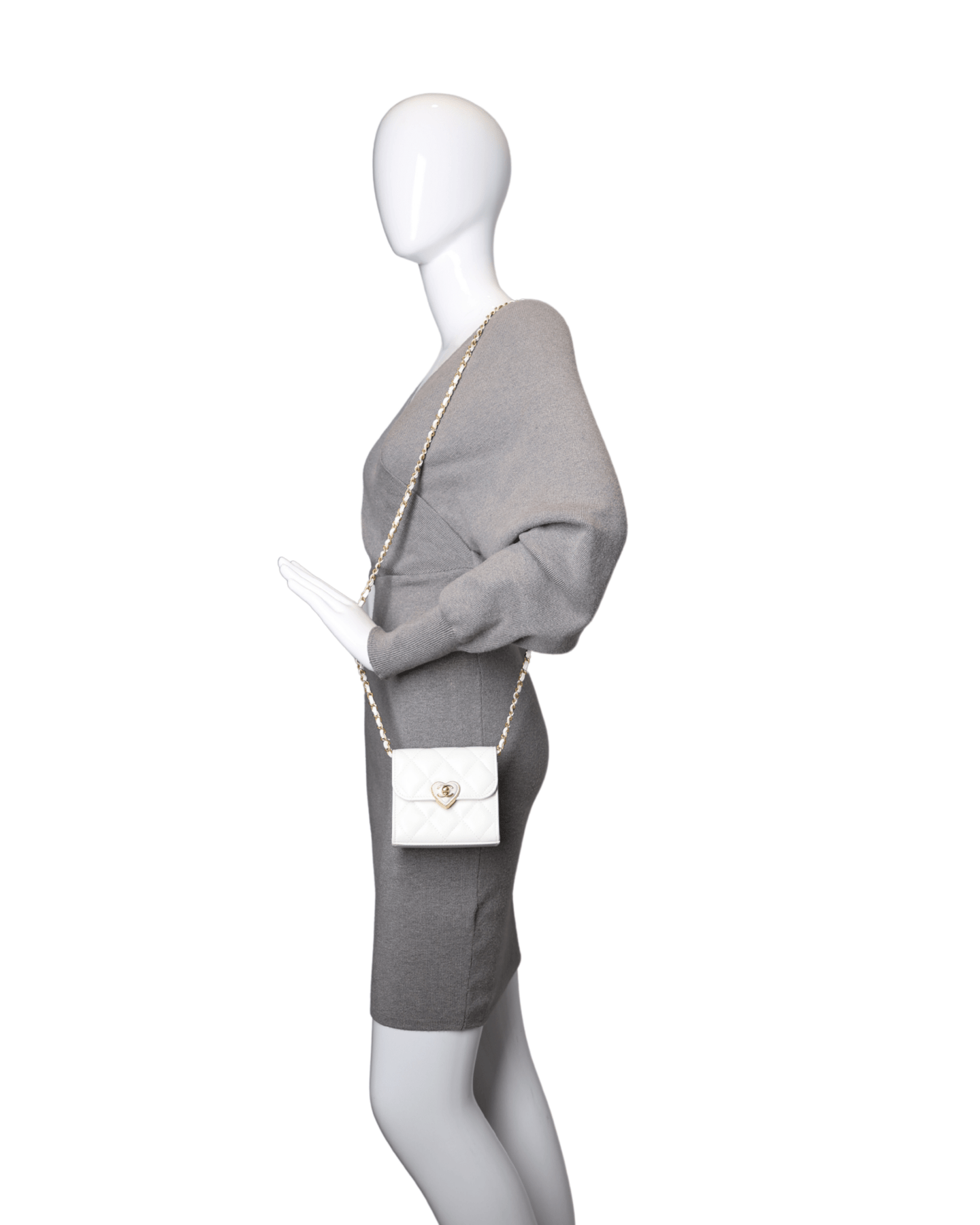 This Chanel Mini Flap Bag is crafted from glossy white patent leather with diamond quilting and gold-tone hardware. It features a heart-shaped turn-lock closure with an interlocking CC detail and a leather-threaded chain strap for shoulder or crossbody wear. The compact interior is lined and designed to hold small essentials. With its structured silhouette and unique closure, this mini bag offers a playful take on a classic Chanel design.