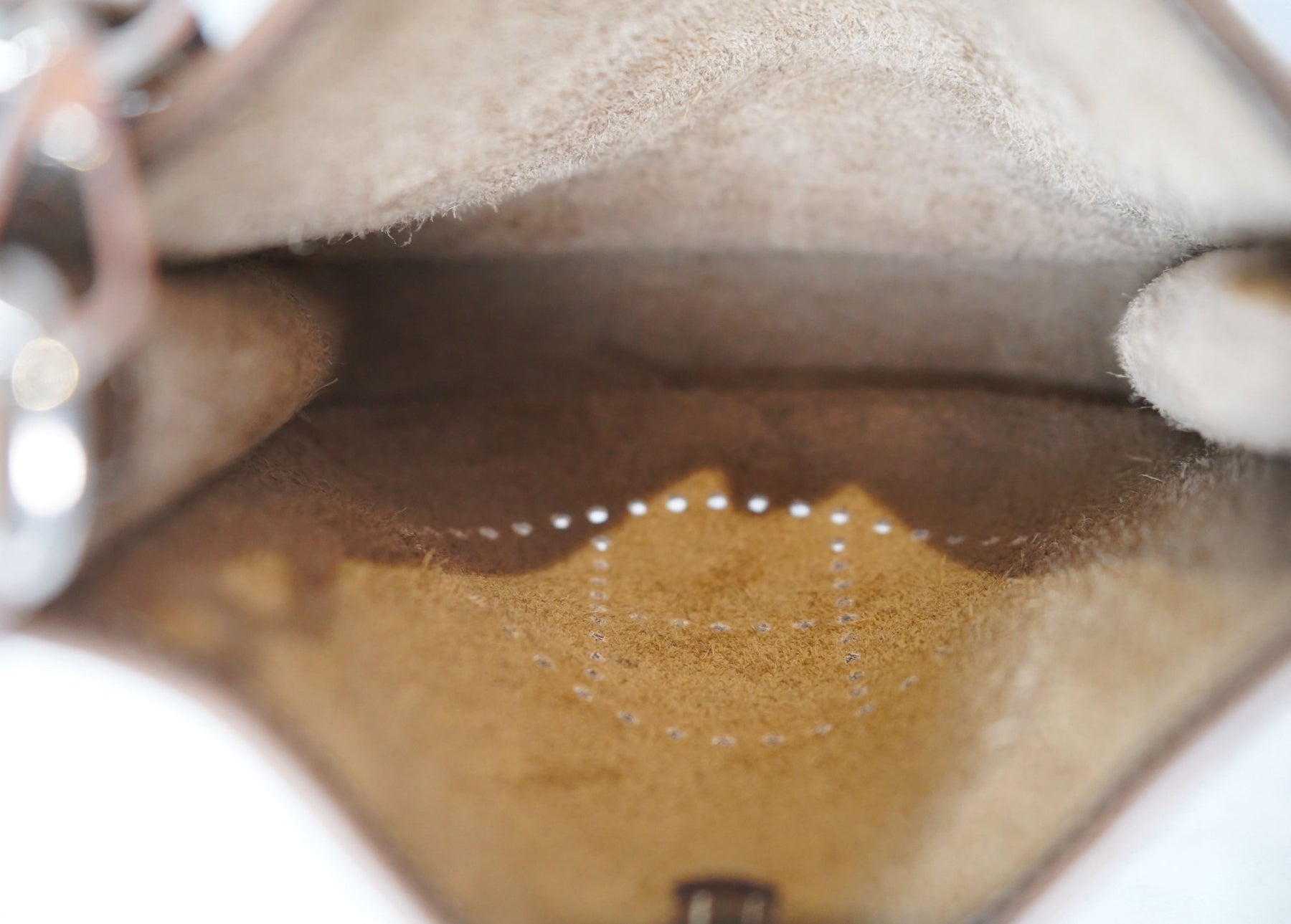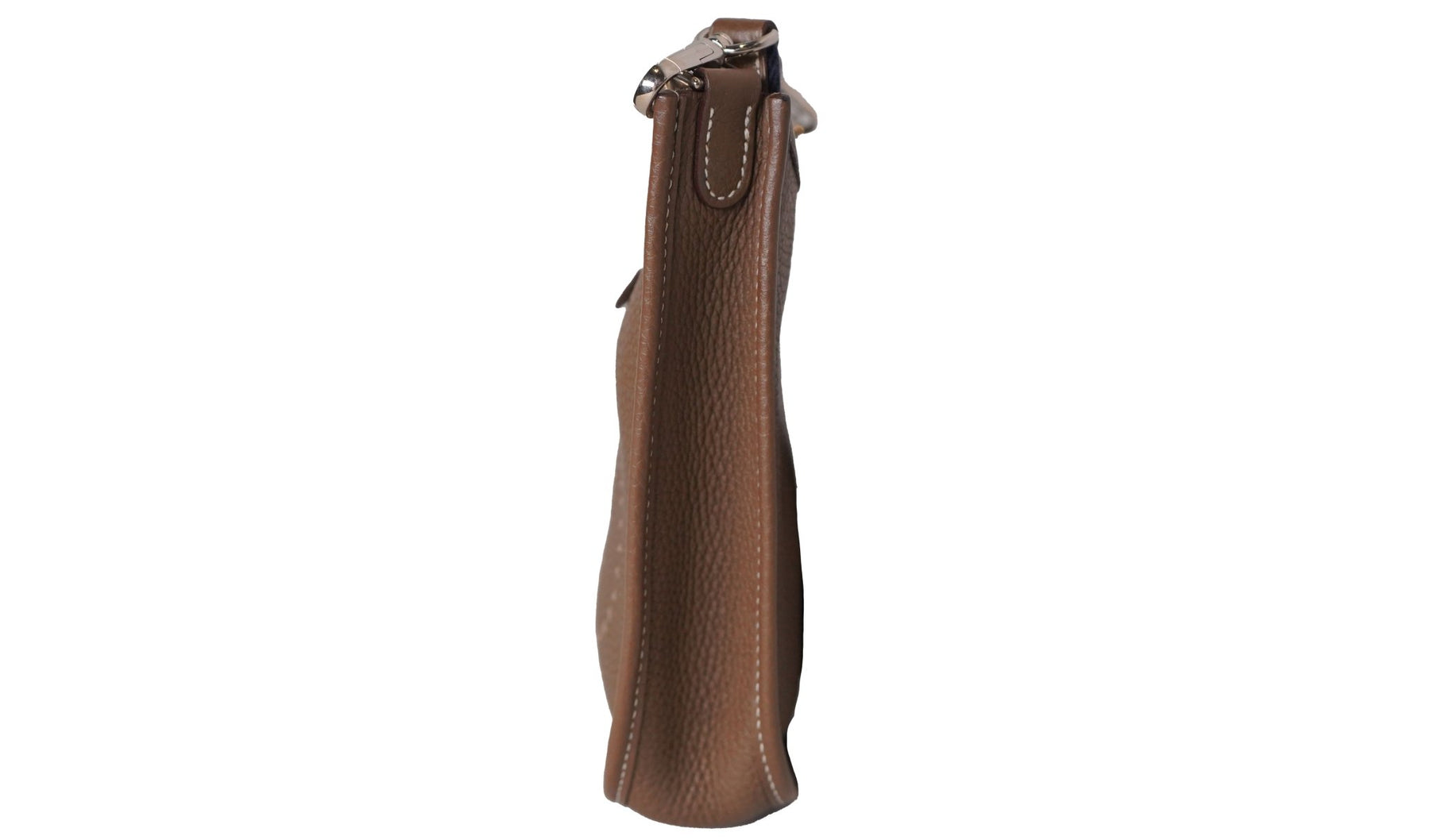 This is an authentic HERMES Taurillon Clemence Amazone Evelyne TPM in Etoupe and Bleu Indigo. This small chic messenger bag is crafted of rich taurillon clemence calfskin leather in taupe. The shoulder bag features a dark blue canvas body strap, gold plated hardware, and a perforated Hermes H oval logo. The top of the bag opens with a crossover strap to a matching suede interior.