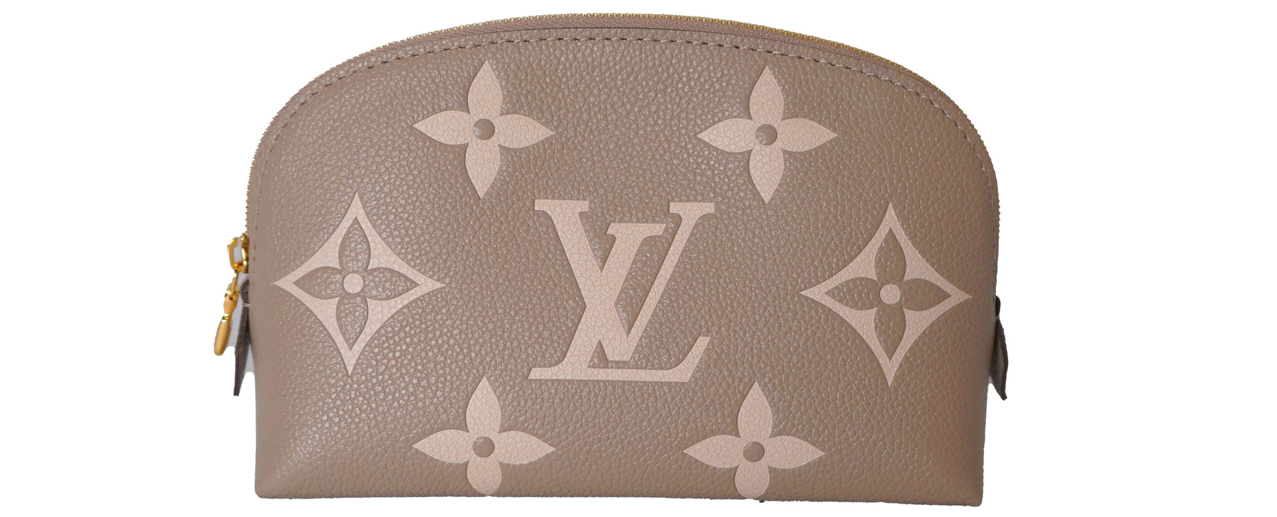 This is an authentic LOUIS VUITTON Empreinte Monogram Giant Cosmetic Pouch PM. This stylish pouch is crafted of classic Louis Vuitton monogram-embossed leather in taupe and beige. The gold wrap-around zipper opens to a compact taupe leather-like interior with a patch pocket.
