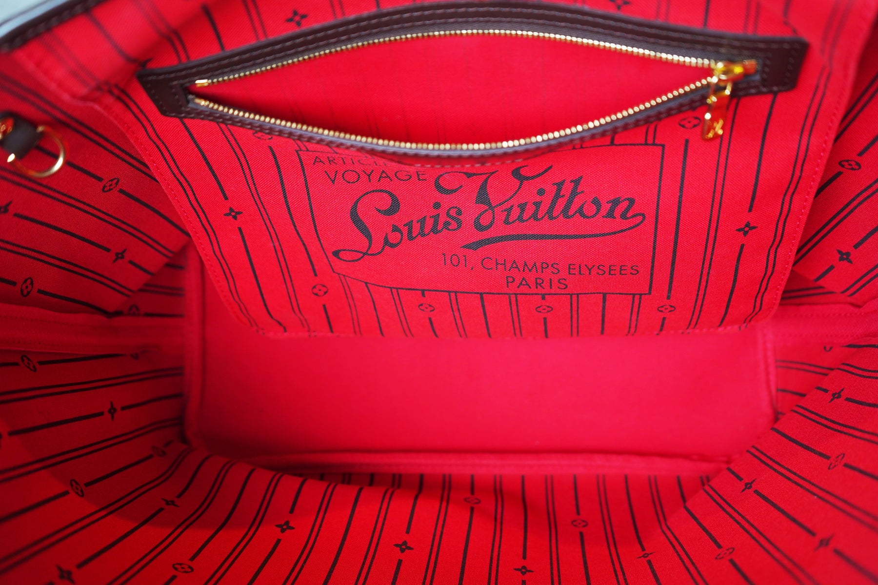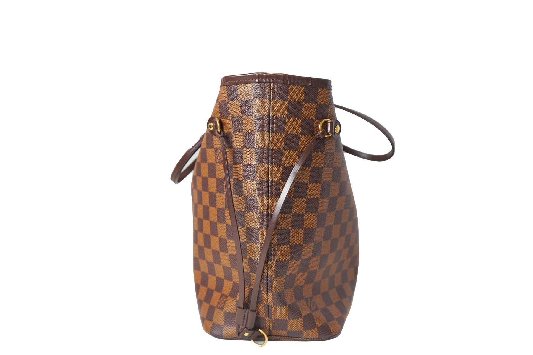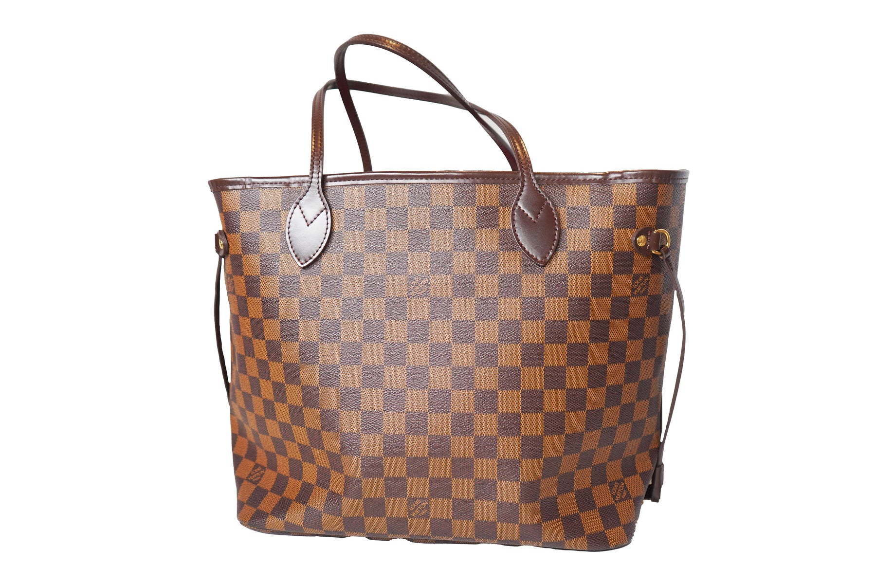 The Neverfull MM tote unites timeless design with heritage details. Elegant in Damier Ebene canvas with natural cowhide trim, it is roomy but not bulky, with side laces that cinch for a sleek allure or loosen for a casual look. Slim, comfortable handles slip easily over the shoulder or arm. Lined in colorful textile, it features a removable pouch which can be used as a clutch or an extra pocket.