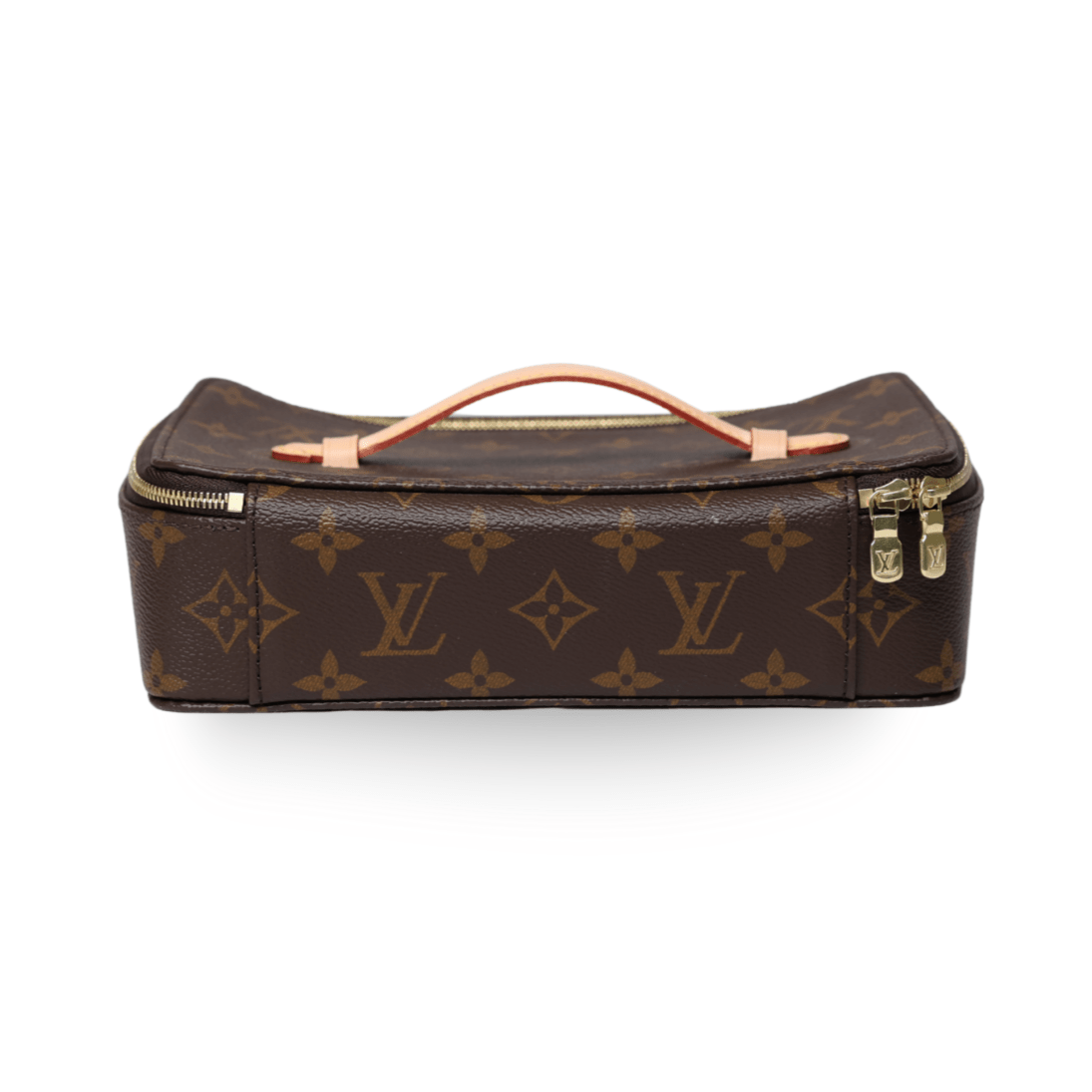 This authentic, pre-owned Louis Vuitton Nice Vanity Case is crafted from classic Monogram coated canvas with natural vachetta leather trim and gold-tone hardware. The structured silhouette features a leather top handle and wrap-around zip closure, offering both elegance and functionality. Ideal for organizing beauty essentials or styling as a unique accessory, this piece blends timeless design with versatile use.