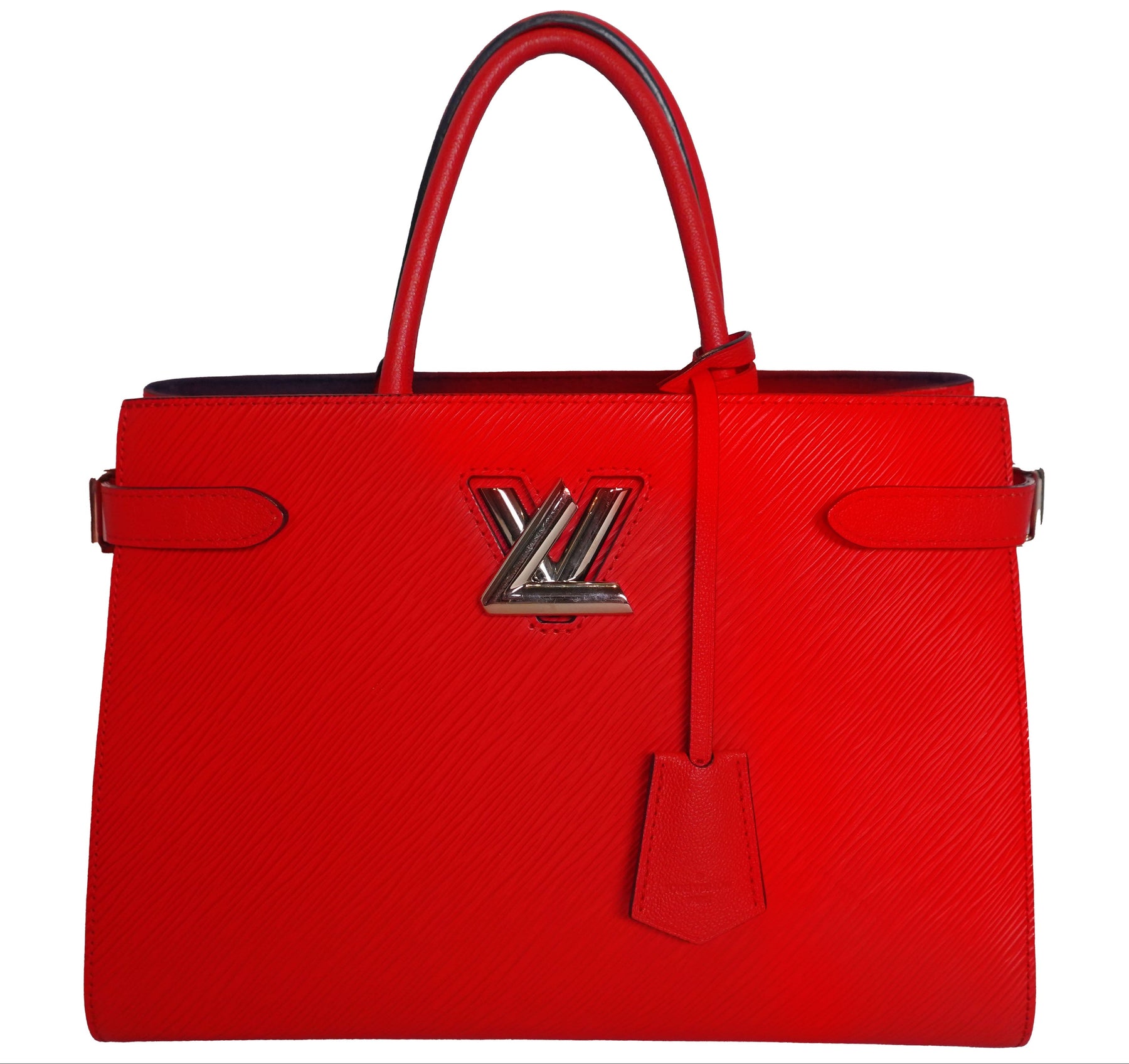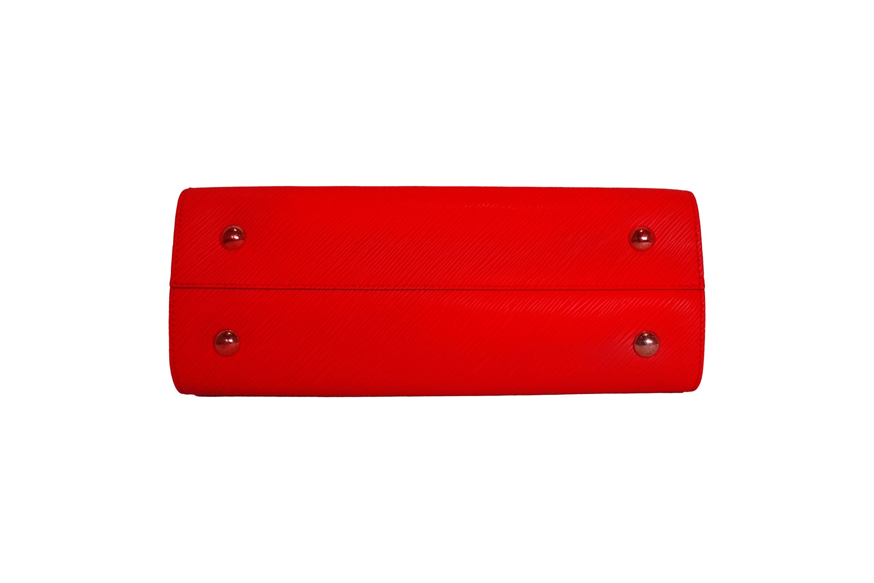 This is an authentic LOUIS VUITTON Epi Twist Tote in Coquelicot. This stylish tote is crafted of textured epi leather in red. The handbag features blue glazing trim, red stitching, adjustable leather side straps, and polished silver hardware including a frontal LV turn lock. The top opens to a partitioned blue microfiber interior with a center zipper and patch pockets.