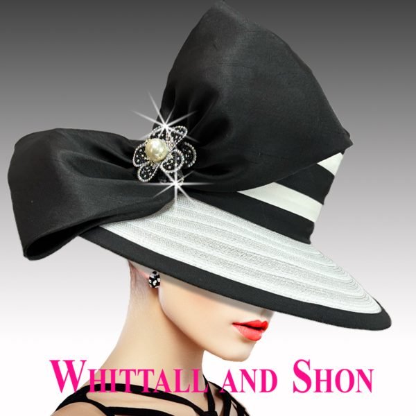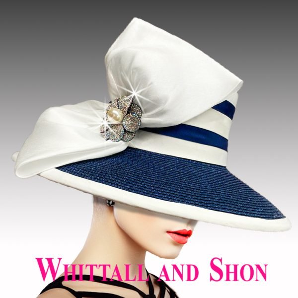 Like its namesake, this stylish hat is simple, clear and commanding. The 4.5″ crown and 5″ brim, adorned with military stripes, are a tribute to a great American hero. The military tone, however, is softened with a profile bow and a crystal encrusted camellia. An adjustable sweatband allows for differing head sizes. A must for the Derby!