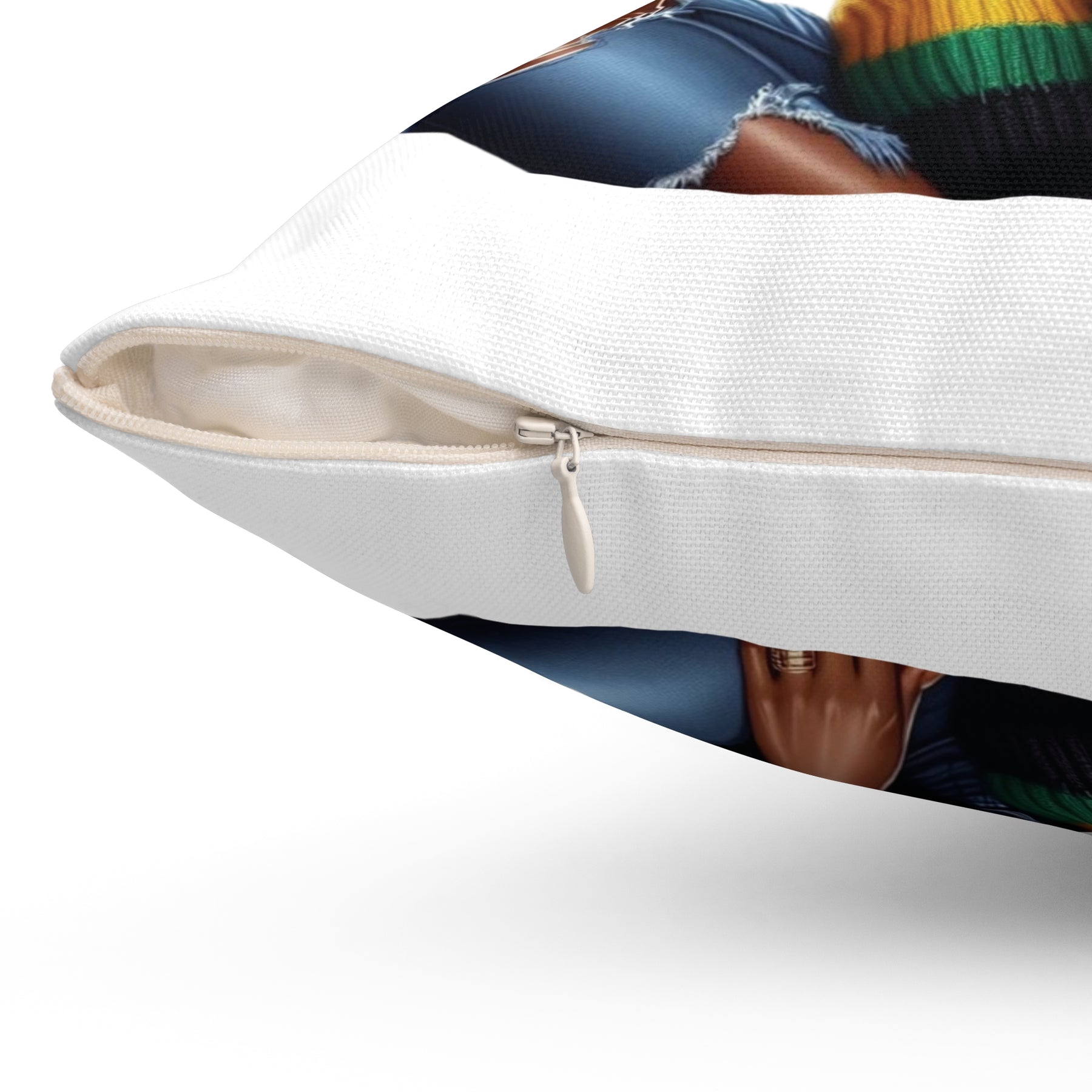 This square pillow brings warmth, culture, and bold style to any room. The double-sided print showcases a confident woman with voluminous natural curls, layered gold jewelry, and a cozy off-shoulder sweater in rich, earthy stripes—an image that reads both modern and soulful. The spun polyester cover keeps the design crisp and wrinkle-free, while the slightly oversized recycled polyester insert gives the cushion a plush, rounded feel when assembled. Tuck it on a couch, chair, or bed to add texture and personality; it blends with boho, Afrocentric, and contemporary decor and creates a calm, empowered atmosphere where stories and laughter gather.