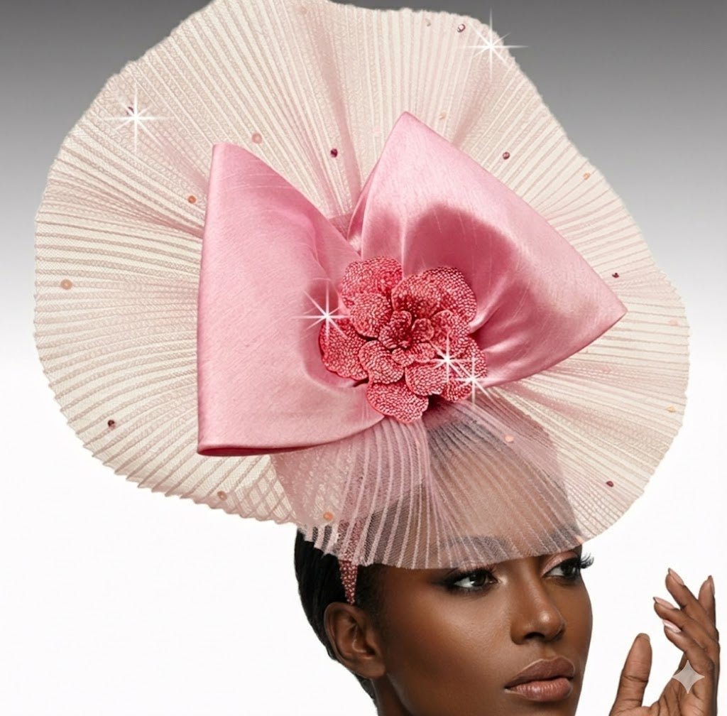 Midnight Rose is a striking headband fascinator that blends drama with refined elegance. A sleek jewel headband supports a sculptural, pleated disc that fans outward in a bold circular silhouette, subtly dusted with sparkle for a glamorous shimmer. A rhinestone-encrusted floral motif lounges glamorously in the center. Sophisticated and eye-catching, Midnight Rose is perfect for the Derby, for church or any special occasion.