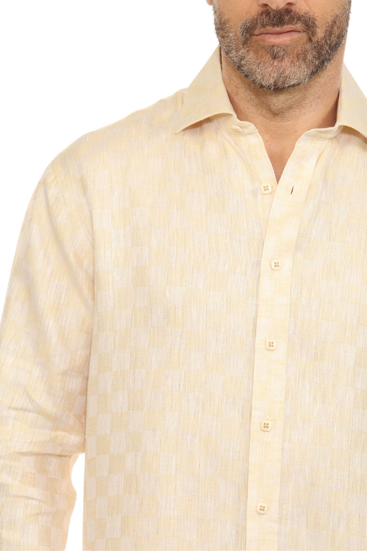 Stay cool, sharp, and effortlessly stylish with this premium 100% Linen shirt. Designed for comfort and breathability, the yellow base is accented with fine checkered print, offering a timeless, versatile look ideal for warm-weather wear or upscale casual dressing.