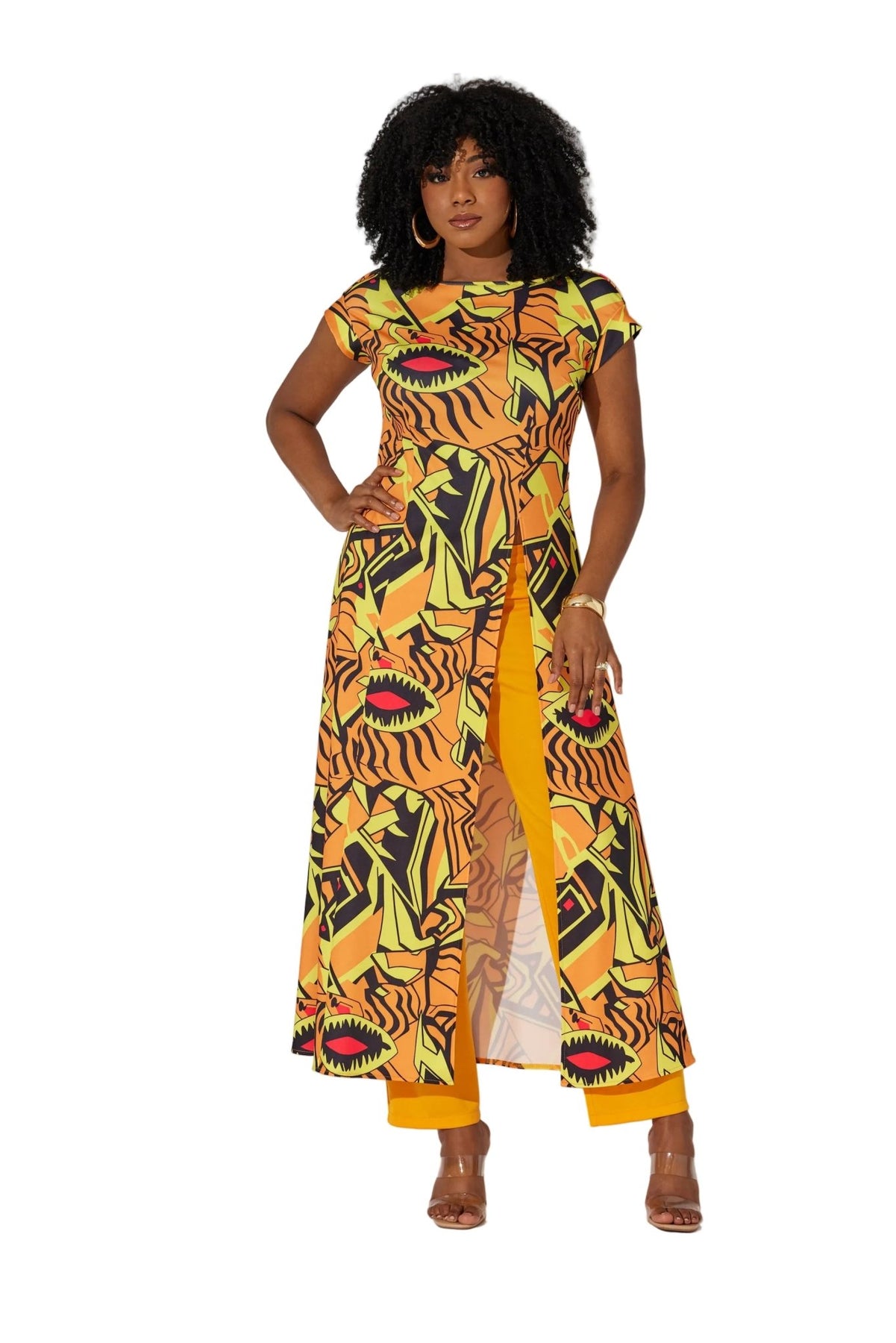 This is not just an outfit - this is a whole statement about who you are and where you come from. This yellow multi tribal print pantset from Studio EY is powerfully personal, boldly beautiful, and the kind of plus size special occasion look that stops people mid-sentence just to ask where you got it. The sweeping 55" top with its dramatic high slit and the sleek straight-leg pants are giving coordinated perfection from head to toe. Whether you are celebrating a cultural event, stepping into a special occasion dinner, showing up to a church function in full Afrocentric glory, or serving looks at a wedding as the most memorable guest in the room, the Tribal Love Pantset is the one outfit that tells your whole story without saying a single word.