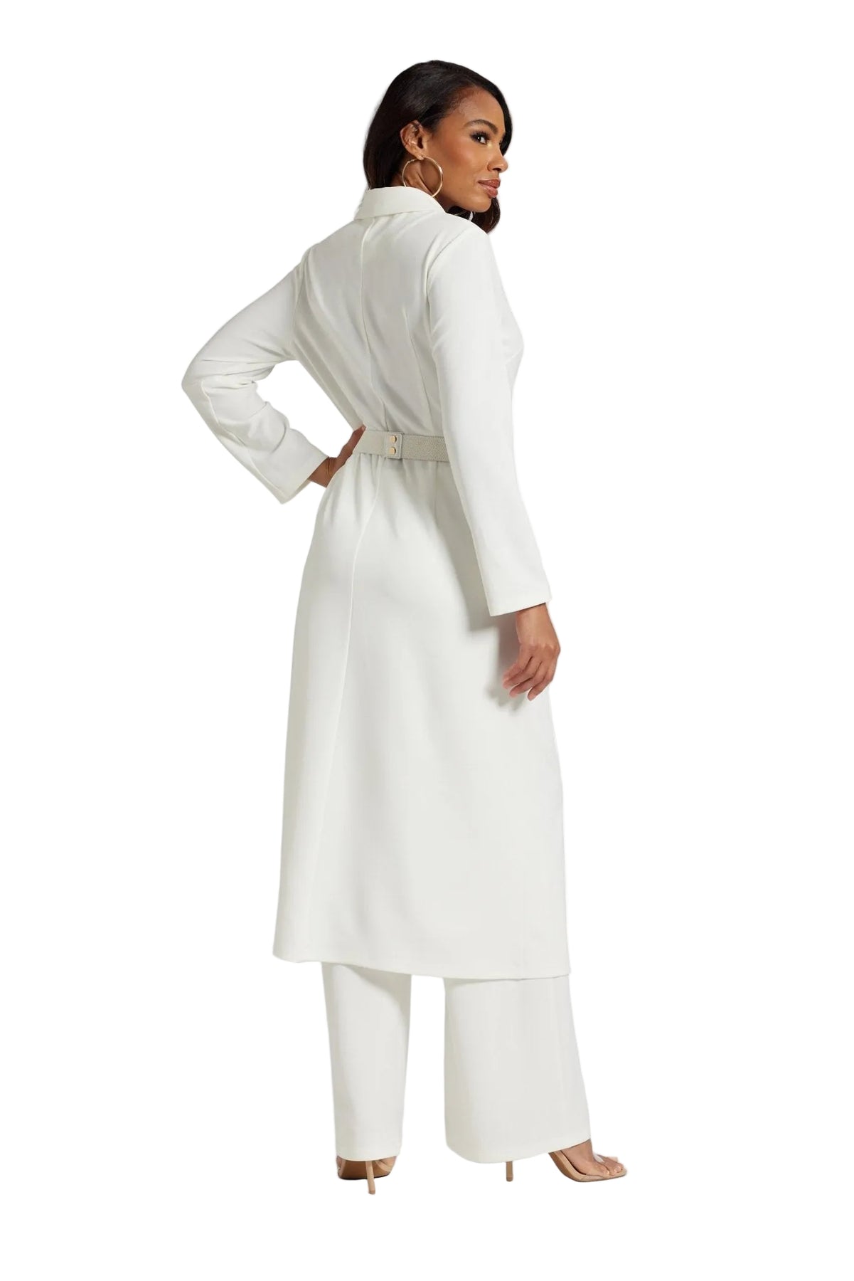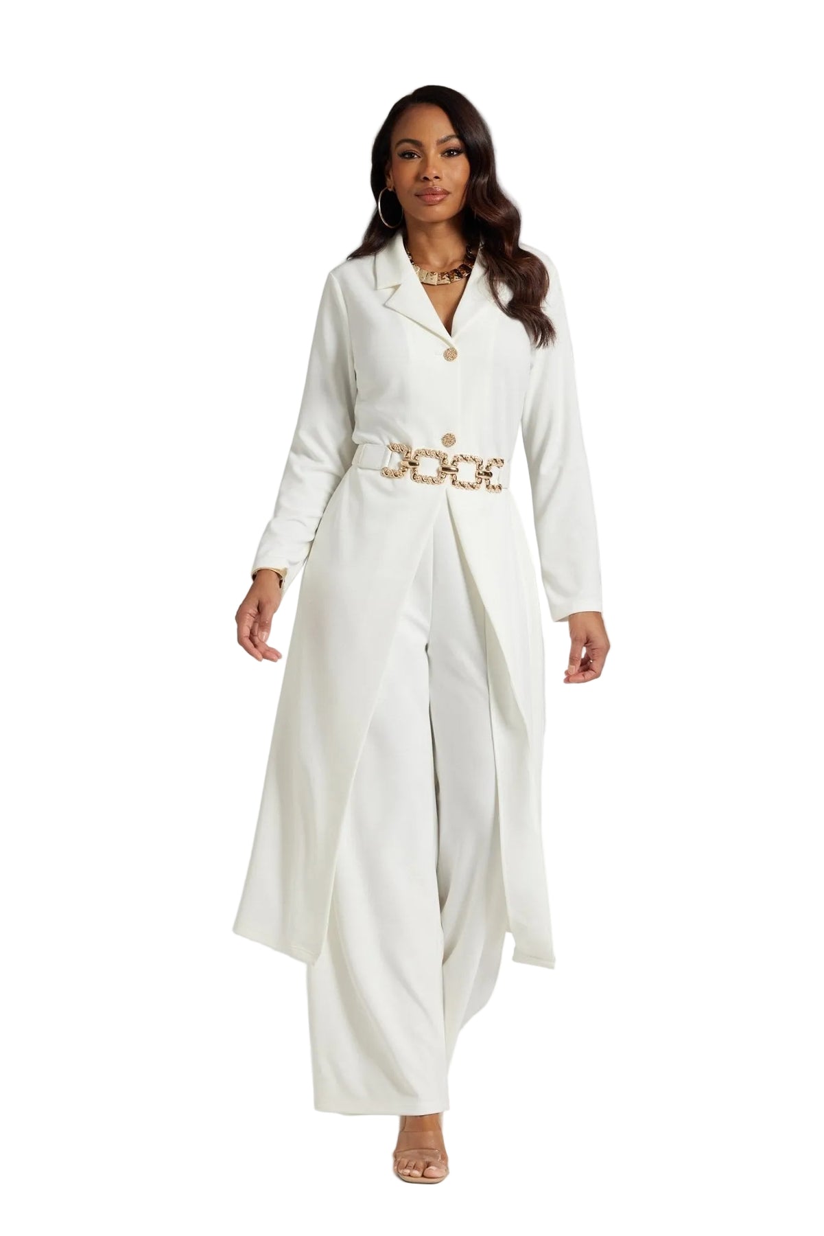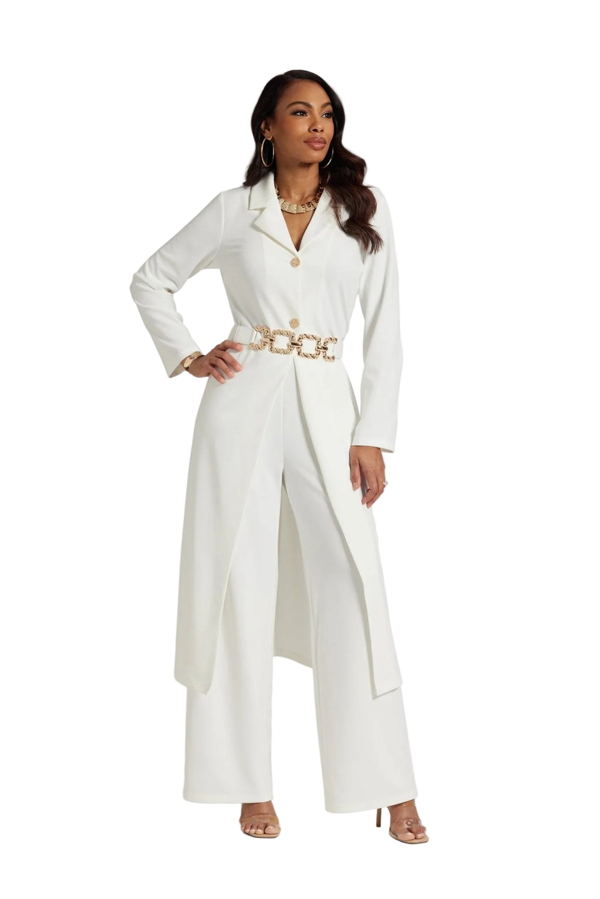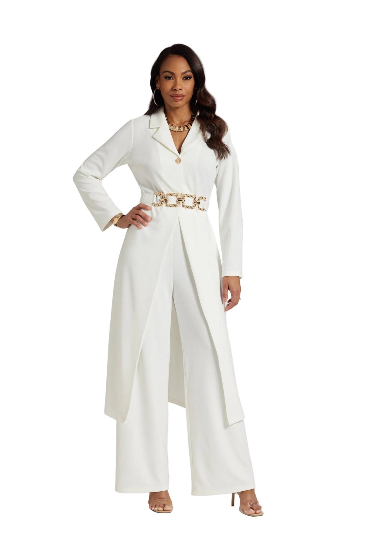 This classy knit crepe ensemble is all business and total beauty. As a highlight of our Especially Yours pant suits, this look keeps you polished and put-together. The 51 1/2" jacket features jeweled buttons and shaping darts to snatch your silhouette, while the wide-leg styling offers a sophisticated edge. Whether you need ladies white suits for church or an elegant women church suit, this delivers. This special occasion pant suit plus size includes a 32" inseam pant and jeweled belt for maximum impact. Perfect for Sunday service or a church banquet, this white plus size suit for women is high-quality fashion. Express your faith in a style that makes you feel bold and strong.