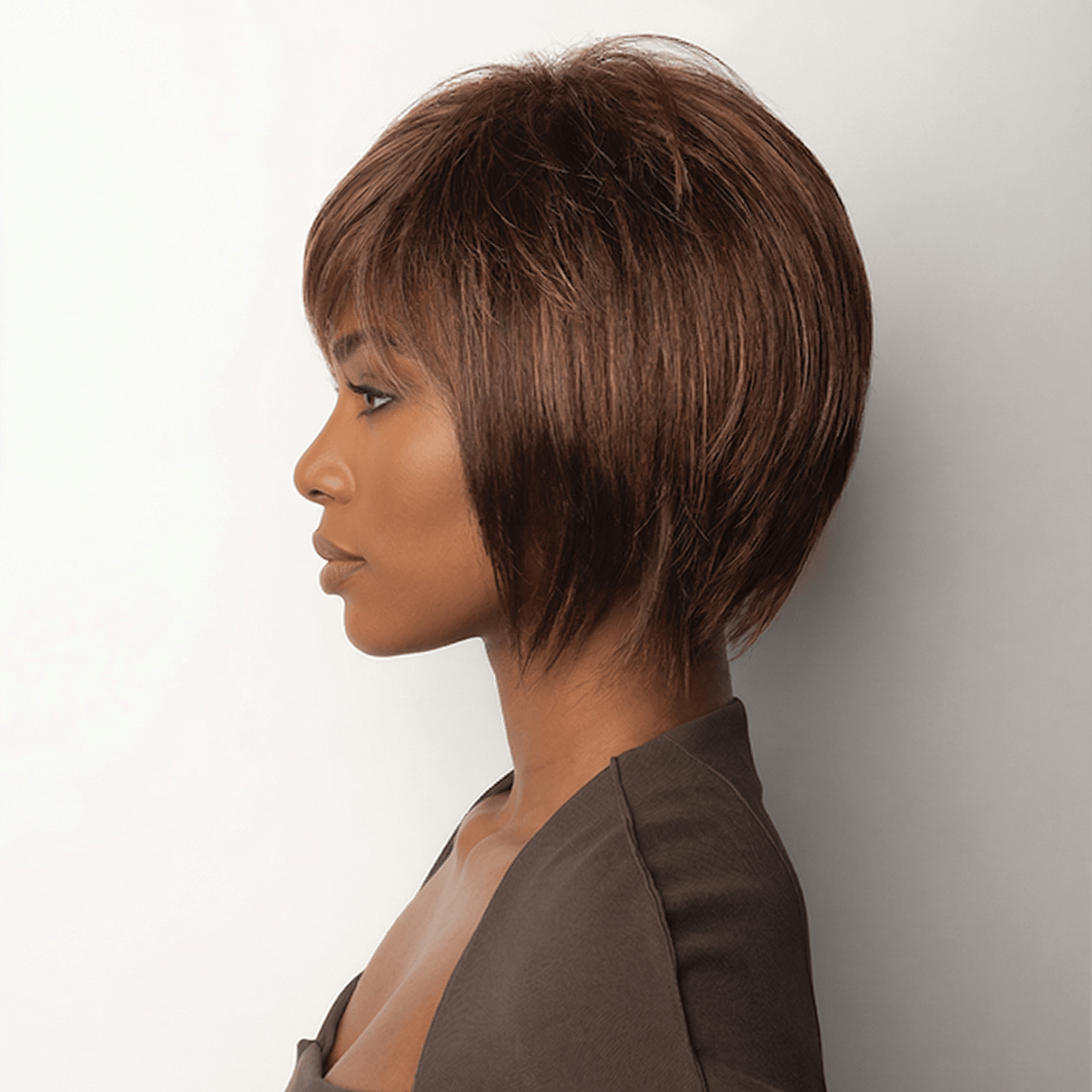 A short bob with side swept bangs and textured layers. This straight ready-to-wear is a short bob with side swept fringe and textured layers to give you that jazzy style. Anastasia is machine made with adjustable tabs in the back nape area to allow a more comfortable fit. The result is a comfortable fit with a natural look that is both fashionable and easy to wear. Only one is available at this price.